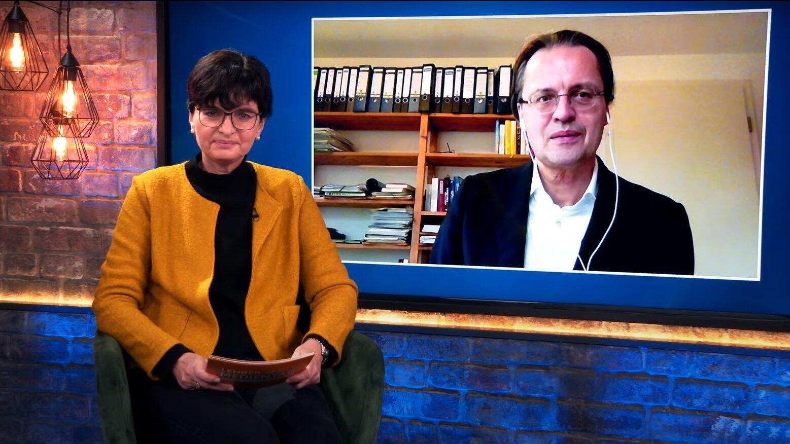 Live-Stream aus dem Studio der Mediaschool Bayern: Sonja Ettengruber, Leiterin der Redaktion Freistunde, im Gespräch mit Medienwissenschaftler Prof. Dr. Bernhard Pörksen.