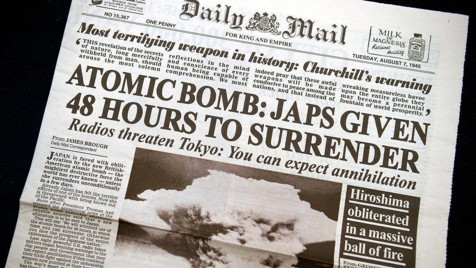 „Ihr könnt mit eurer Vernichtung rechnen“: Einen Tag nach dem Abwurf der Atombombe auf Hiroshima berichtet die britische Tageszeitung „Daily Mail“ triumphierend über die „fürchterlichste Waffe in der Geschichte“, die Japan zur Kapitulation zwingen soll. Doch was die Einwohner Hiroshimas erlitten, versuchte das U.S.-Militär danach geheim zu halten.
