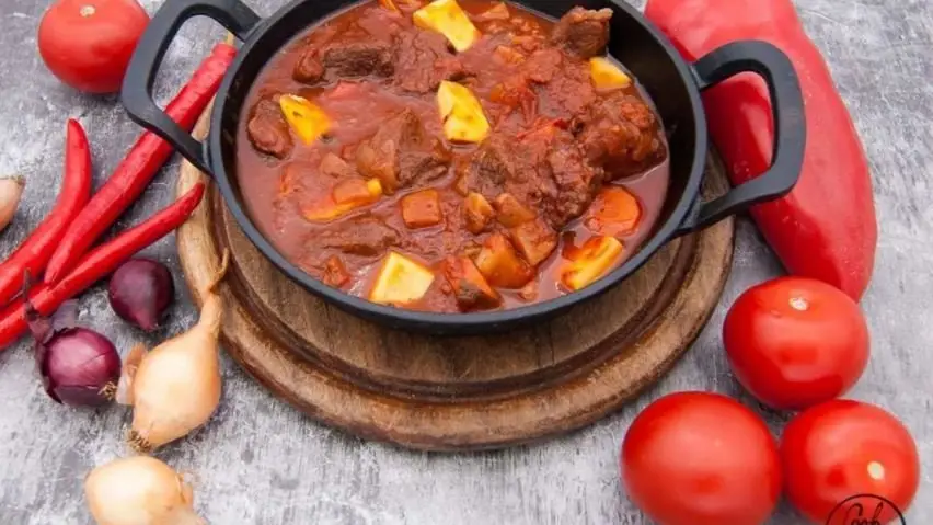 Kombiniert mit Tomaten und der Schärfe der Chili ist dieses Rindergulasch das perfekte Eintopf Essen, das man nicht nur im kalten Winter, sondern auch an lauen Sommerabenden gut genießen kann. Wichtig ist, dass man mageres Suppenfleisch oder ein anderes mageres Rindfleischstück zum Schmoren verwendet, da man es als Einlage im Eintopf mitessen möchte.