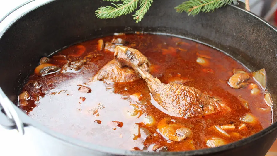 - Das zuvor angebratene Gulasch, den Speck und die Entenkeulen in den Topf in die Soße legen und Wacholderbeeren, Lorbeerblätter und Gewürznelken dazugeben.