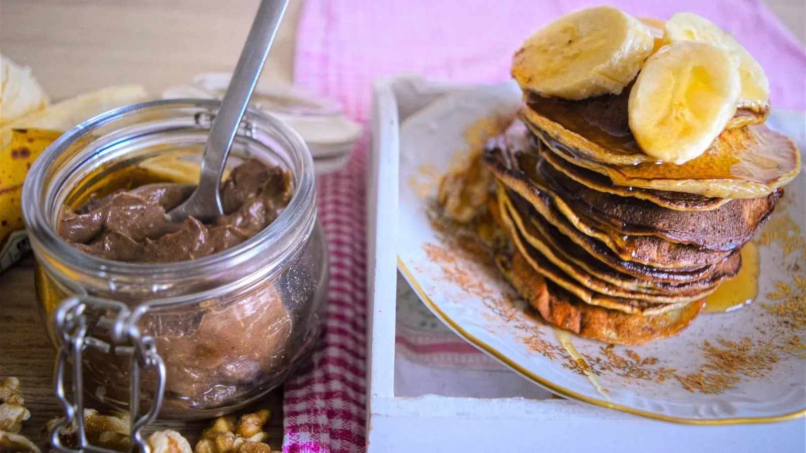 - Die fertigen Pancakes stapeln, mit geschnittener Banane, eventuell Honig und Avocado-Nutella servieren.
