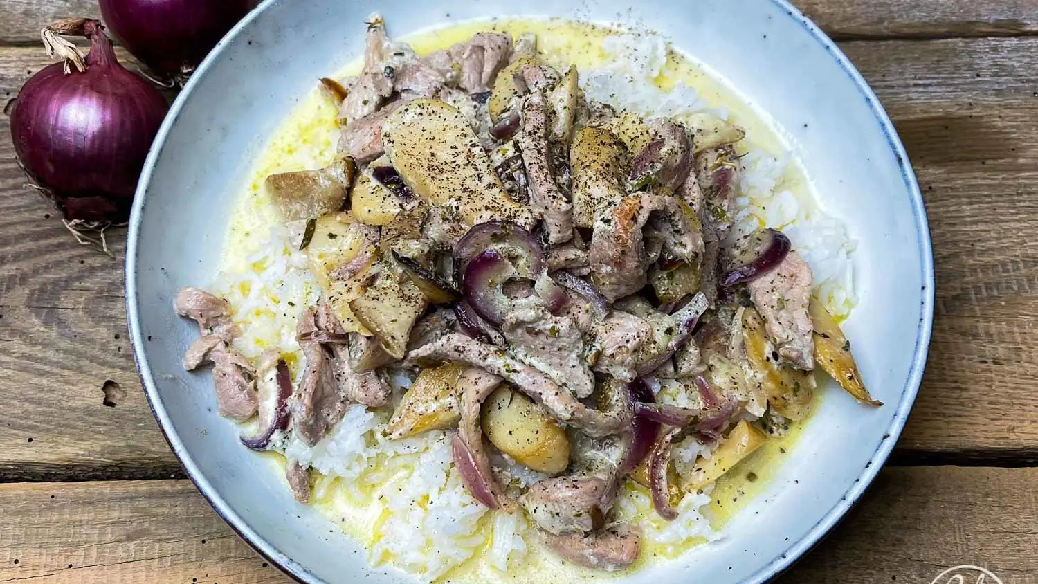 Fleisch, Sahne, Zwiebeln und Pilze sind bei ihnen die Grundzutaten, die nur durch Knoblauch und ein paar Gewürze ergänzt werden. Muskat gibt dem Geschnetzelten ein feines Aroma, während Pfeffer für den nötigen Biss sorgt. Die Sahnesauce wird noch durch einen Schluck Weißwein und Geflügelbrühe verfeinert.