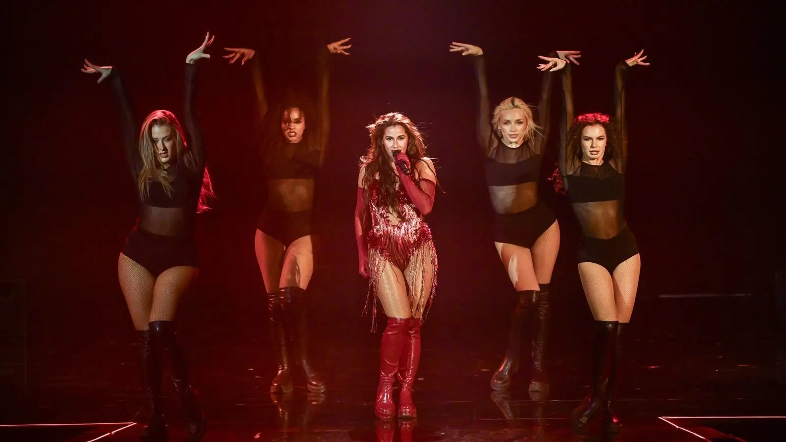 Engels Lied trägt den Titel „Fire“ - auf Deutsch: Feuer - und wurde bei der Show „Eurovision Song Contest - Das Deutsche Finale 2026“ genauso inszeniert. Hohe Flammen züngelten auf der Bühne, während die Sängerin mit ihren Tänzerinnen in einem roten Dress darüber wirbelte.