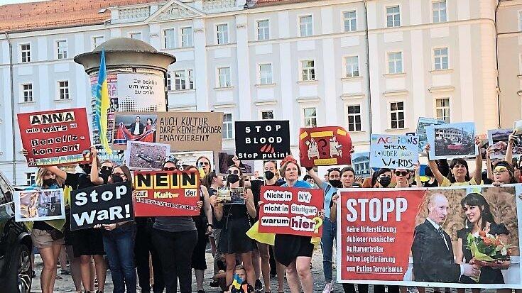 Demonstranten protestieren gegen den russischen Präsidenten Putin und den Auftritt von Anna Netrebko in Regensburg.
