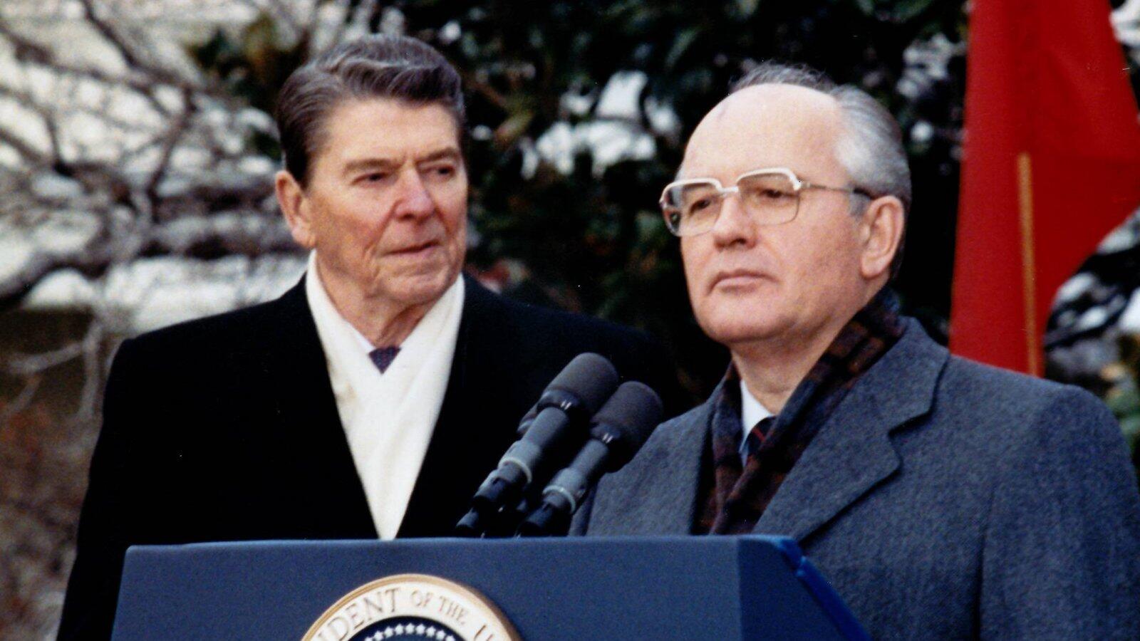 Ein politisches Wunder, das sich hier auch am 8. Dezember 1987 manifestiert: Der Parteisekretär der Kommunistischen Partei der Sowjetunion und Regierungschef der UdSSR, Michail Sergejwitsch Gorbatschow, am Rednerpult der US-Präsidenten im Weißen Haus, wohlwollend betrachtet von US-Präsident Ronald Reagan (links). f