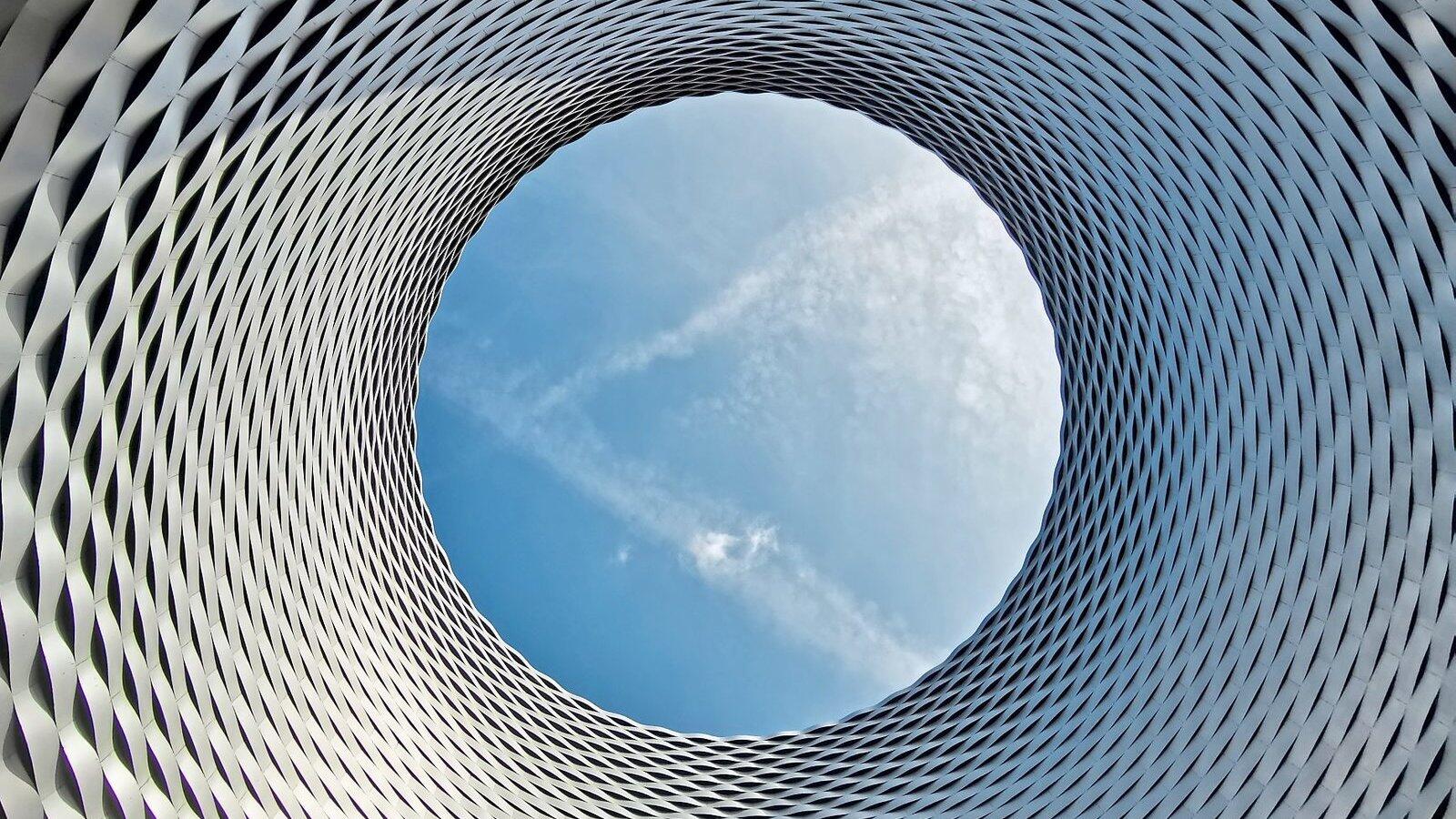 Durch die Lichtöffnung überm Basler Messeplatz strahlt der Himmel. Alles paletti, oder?