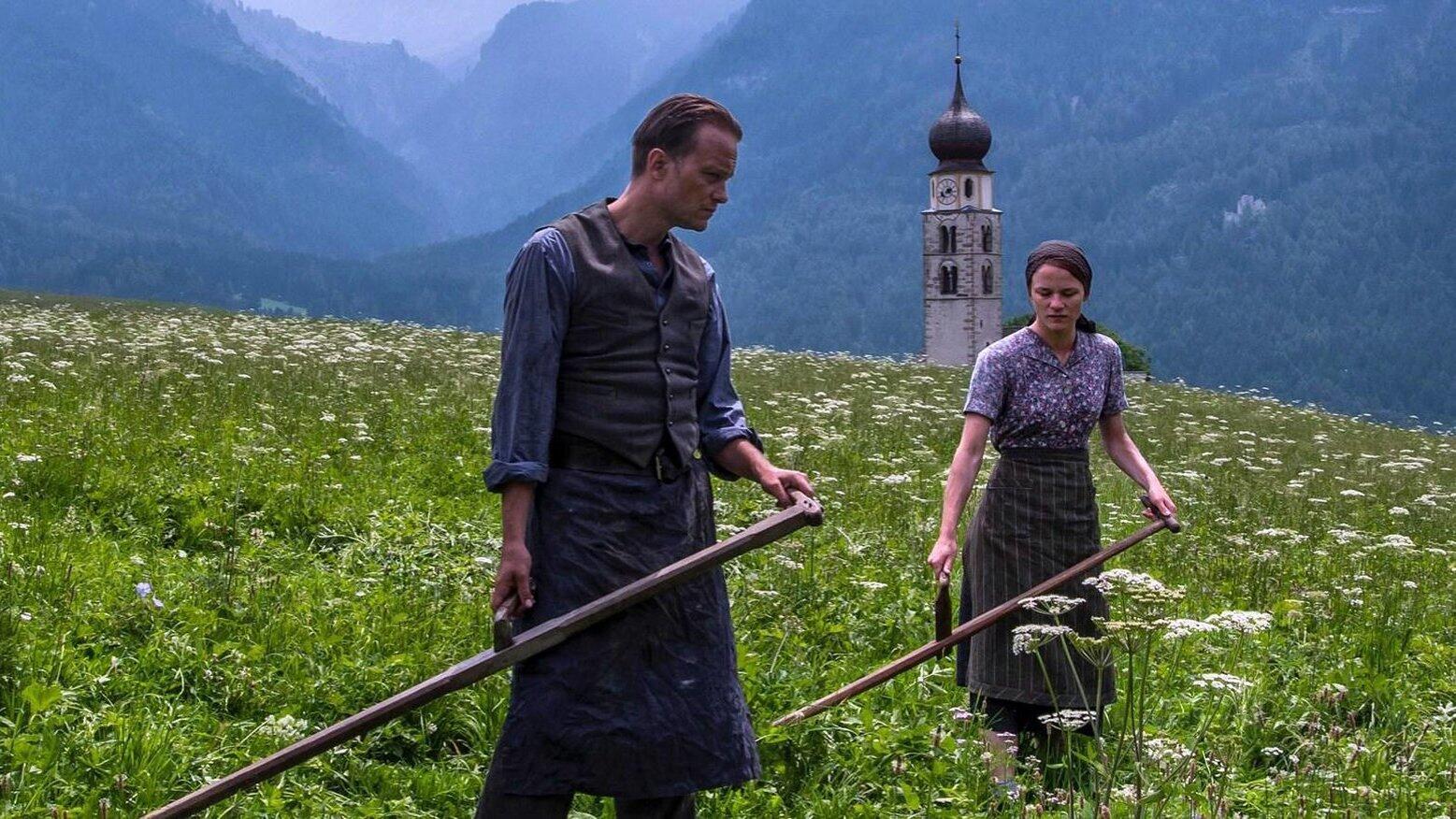 August Diehl und Valerie Pachner als das Bauernpaar Jägerstätter, hier vor der Kirche St. Konstantin in Völs am Schlern.