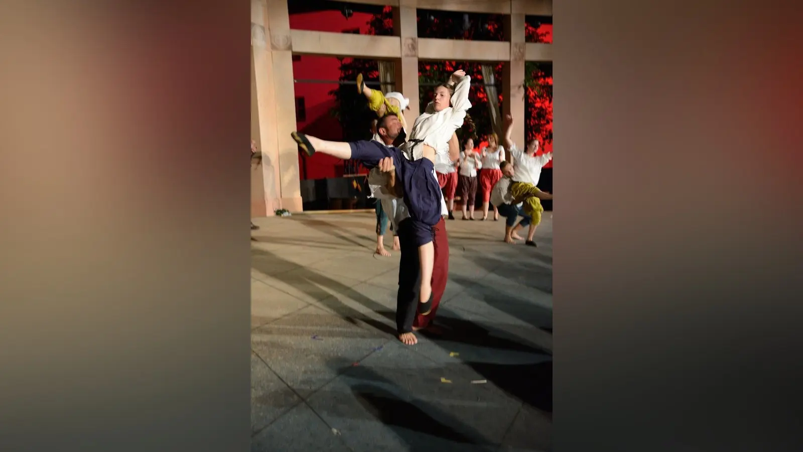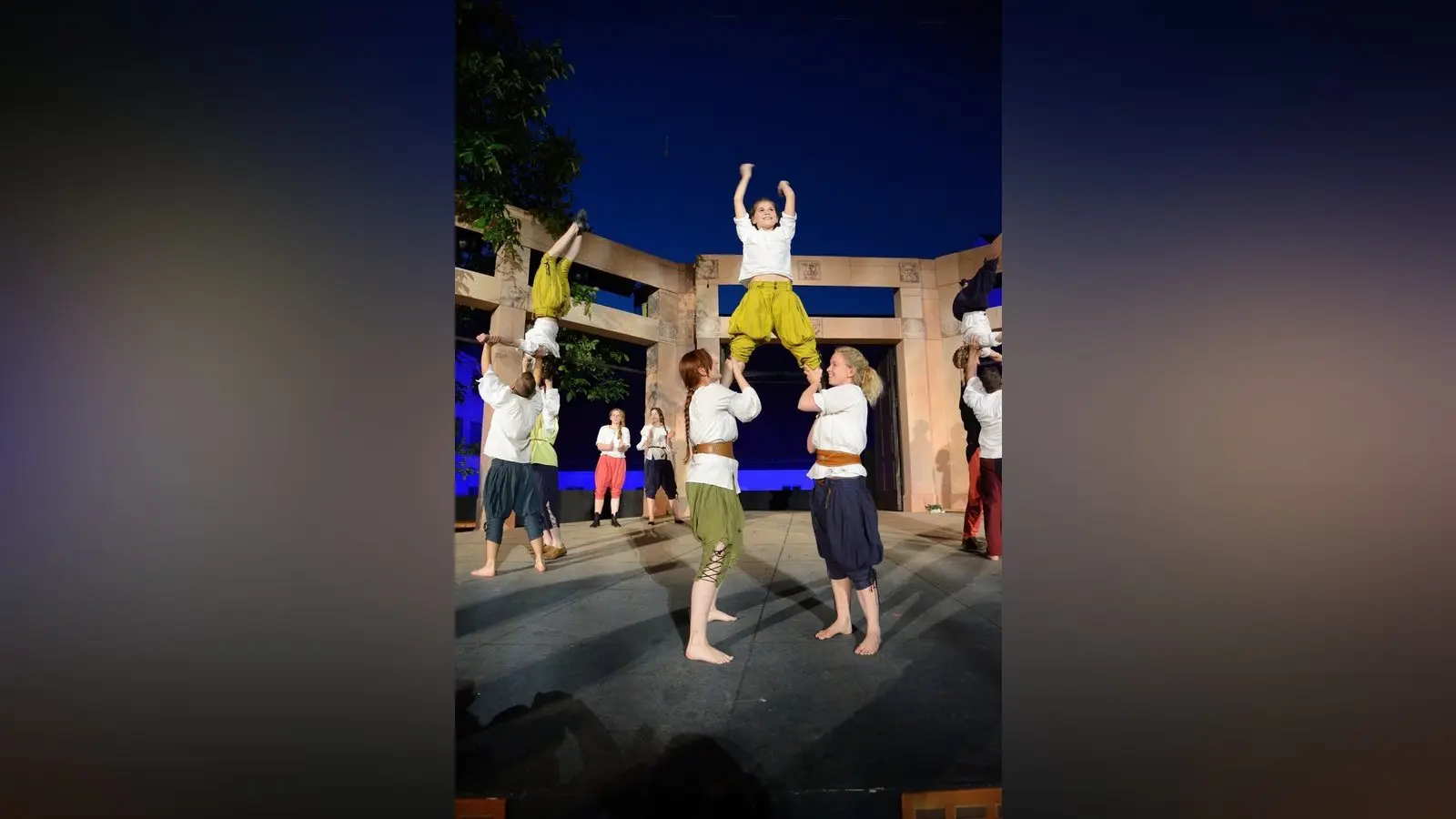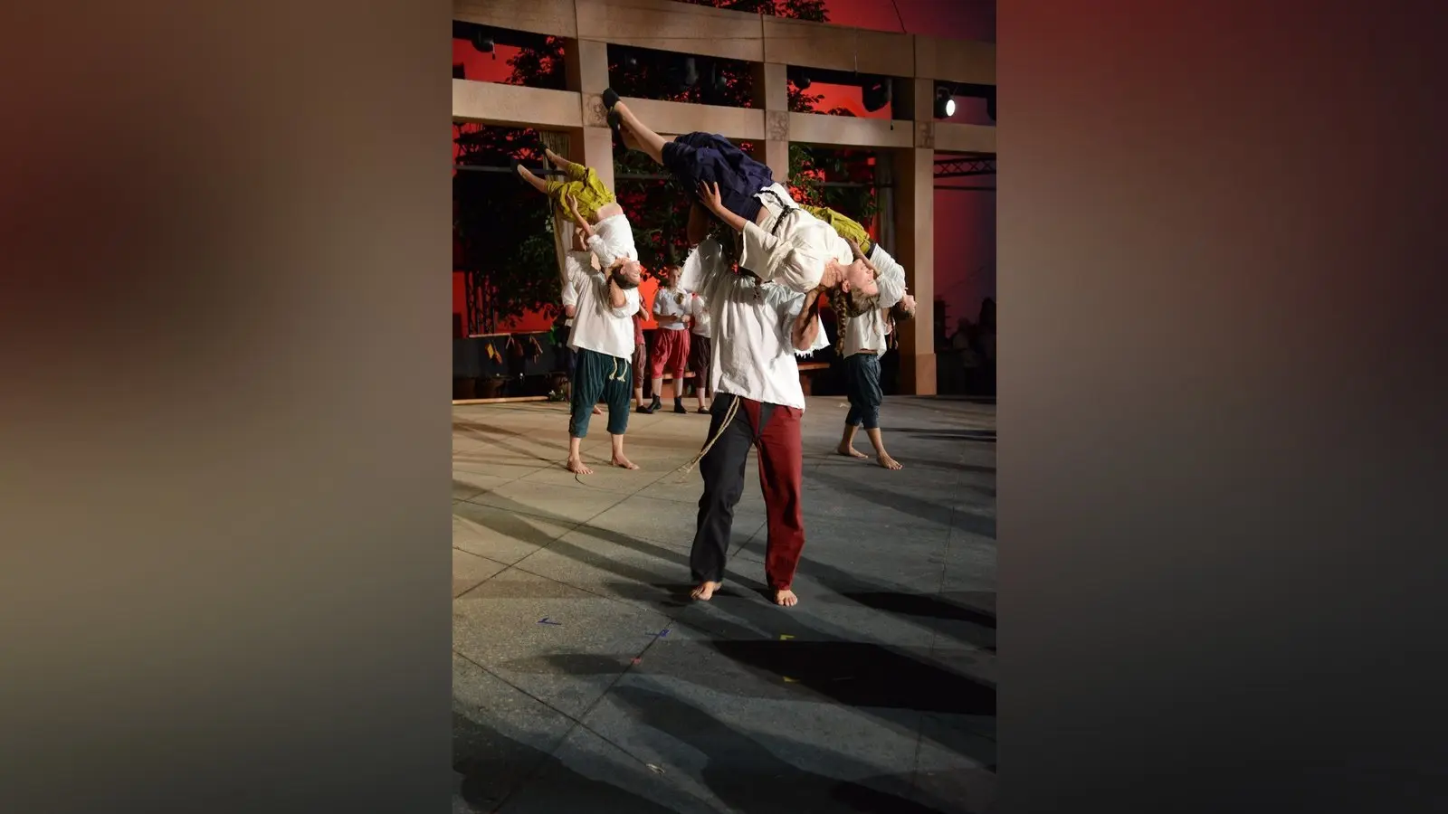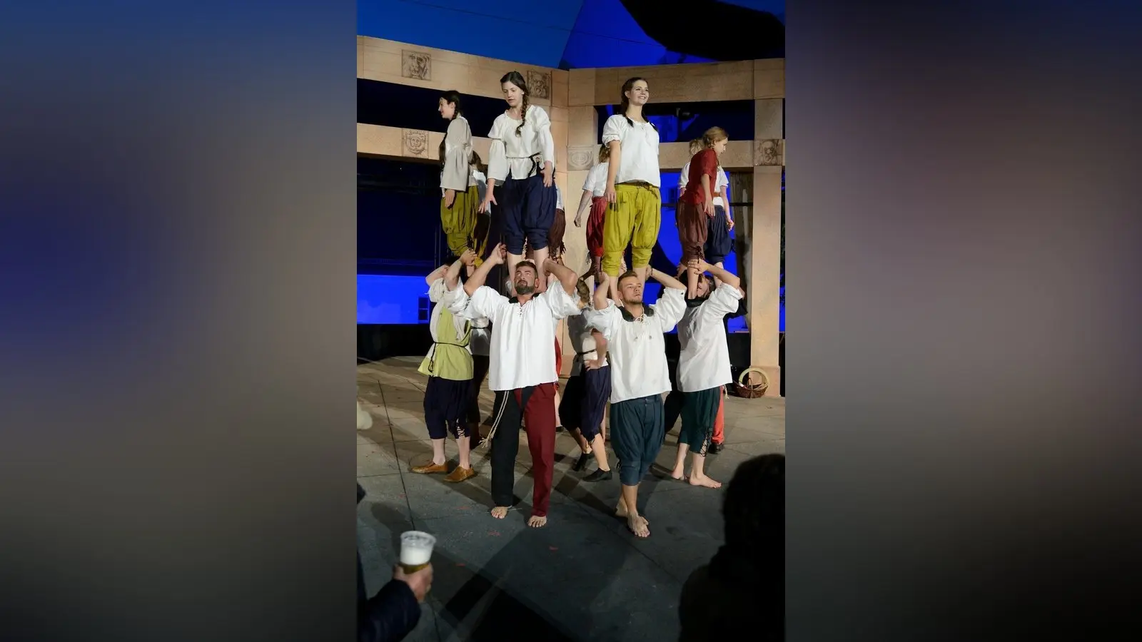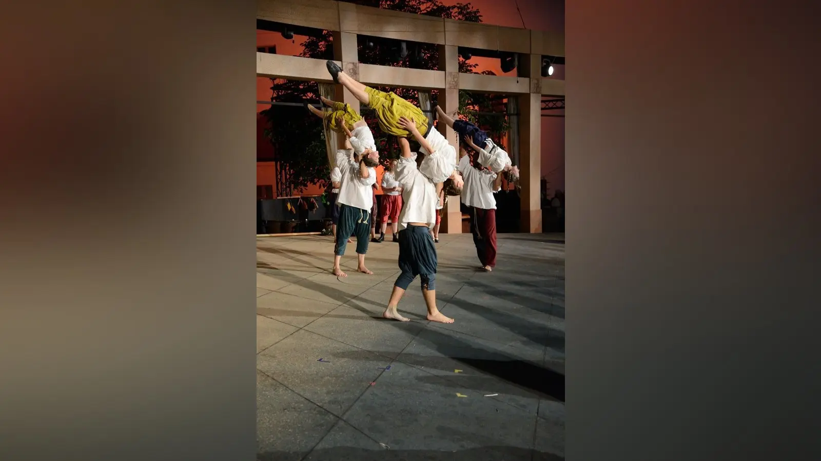 Die Stärke der Truppe gründet sich aber nicht nur auf trainierte Muskeln oder Körperspannung. Die größte Stärke ist wohl, dass sich groß und klein, jung und alt so gut verstehen, auch wenn gerade die halbe Truppe kopfsteht, oder gerade deshalb. Auf der Bühne sieht alles spontan und gewollt durcheinander aus, damit der Zuschauer gar nicht weiß, wo er zuerst hinschauen soll, bei diesem mittelalterlichen Rummel. Dabei ist alles einstudiert und wird vor jeder Vorstellung, wenn alle Gäste bereits ihre Plätze eingenommen haben, vor dem Herzogschloss noch einmal durchgegangen. Wer wann bei wem mit dem Bauch auf den Füßen schwebt, wer von wem in die Luft geschmissen wird und wer Teil einer Pyramide ist.