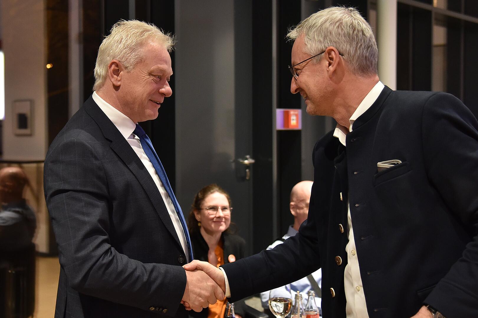 Straubings Oberbürgermeister Markus Pannermayr (CSU, rechts) gratuliert Alois Rainer zum erneuten Einzug in den Bundestag.