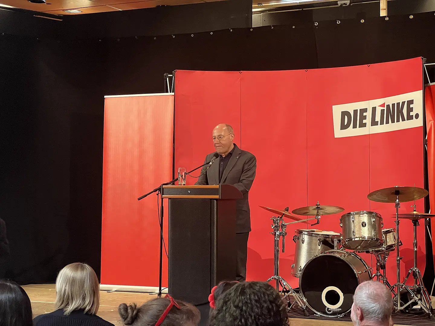 Hauptredner Gregor Gysi ist nun bei den Linken vor Ort und beginnt mit einer kleinen Verzögerung seine Rede.