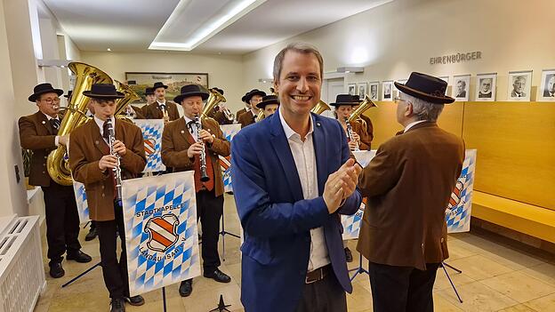 Die Stadtkapelle Landau gratuliert Matthias Kohlmayer mit einem Ständchen. Als erste Amtshandlung darf er dirigieren.