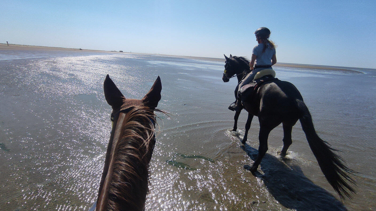 Juni 2023 am Ziel: Birgit Oberloher auf Michl (vorne) mit Tochter Vanessa auf Santos an einem Strand bei St. Peter Ording.
