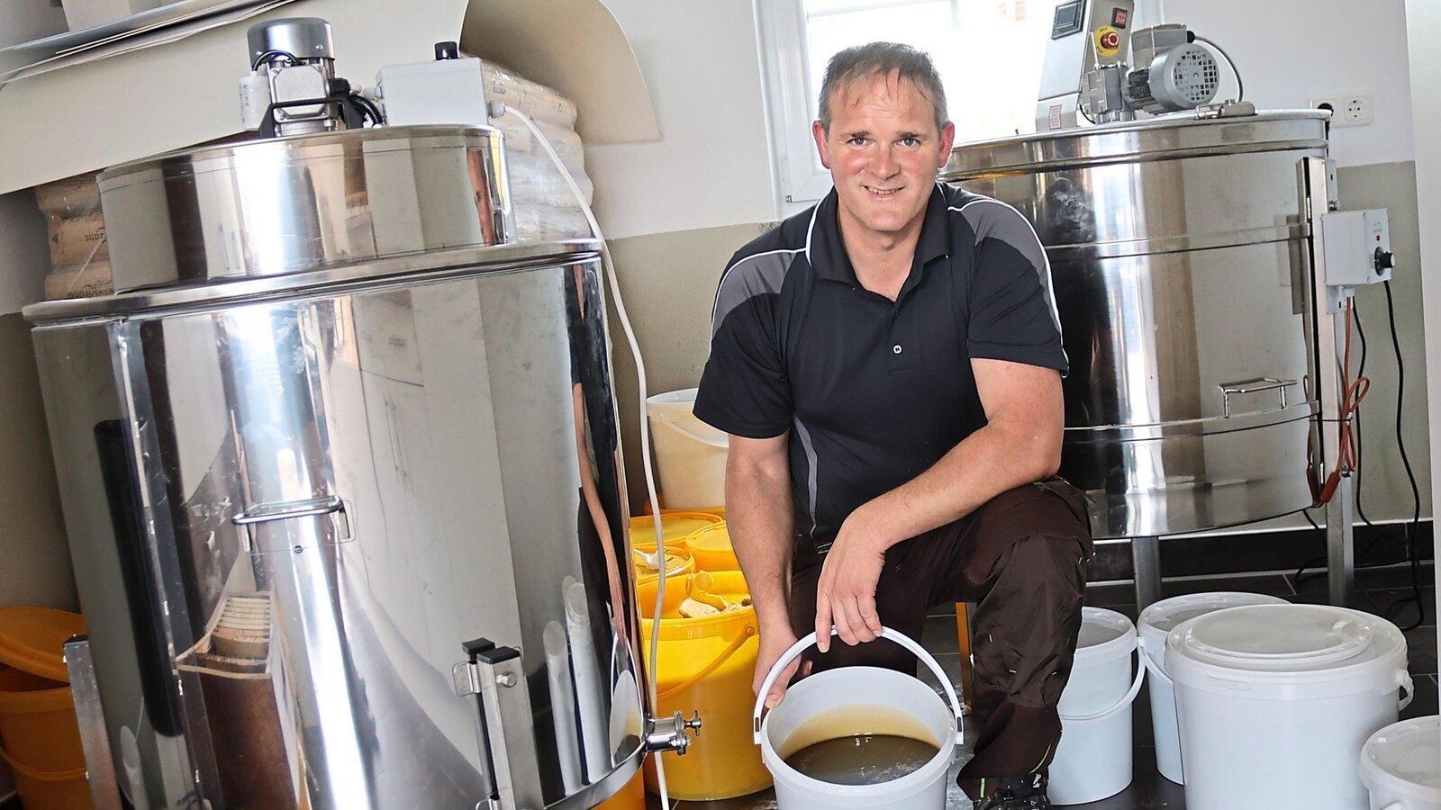 Christian Raab präsentiert das Ergebnis seiner Arbeit mit den Bienen: frisch geschleuderter Waldhonig. Seit fünf Jahren beschäftigt sich der Michelsneukirchener Bürgermeister intensiv mit der Imkerei, hält mittlerweile 17 Wirtschaftsvölker.