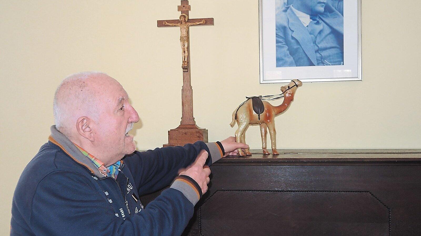 Im Bonhoeffer-Saal seiner Christuskirche, vor dem Bild des Freidenkers, mit seinen Kamelfiguren und in der Gegenwart Gottes, fühlt sich Pfarrer Hans Greulich so richtig wohl.