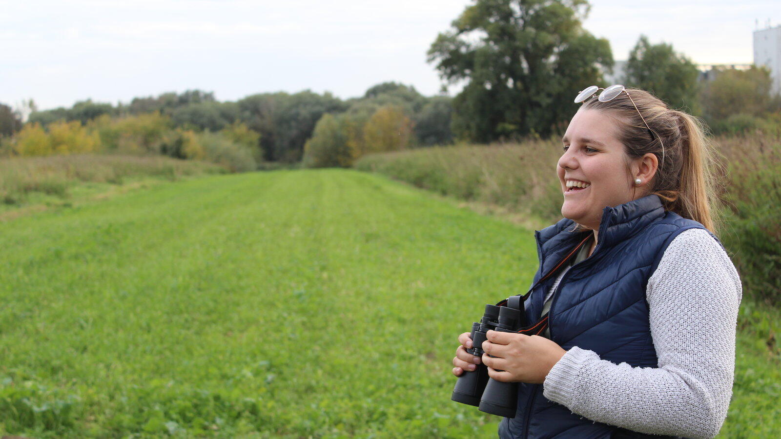 Carolin Bäuml steht auf einem Feldweg in Oberalteich, um den Hals ein Fernglas, an den Füßen Wanderschuhe. Hinter ihr der Bogenberg, vor ihr ein Feld.