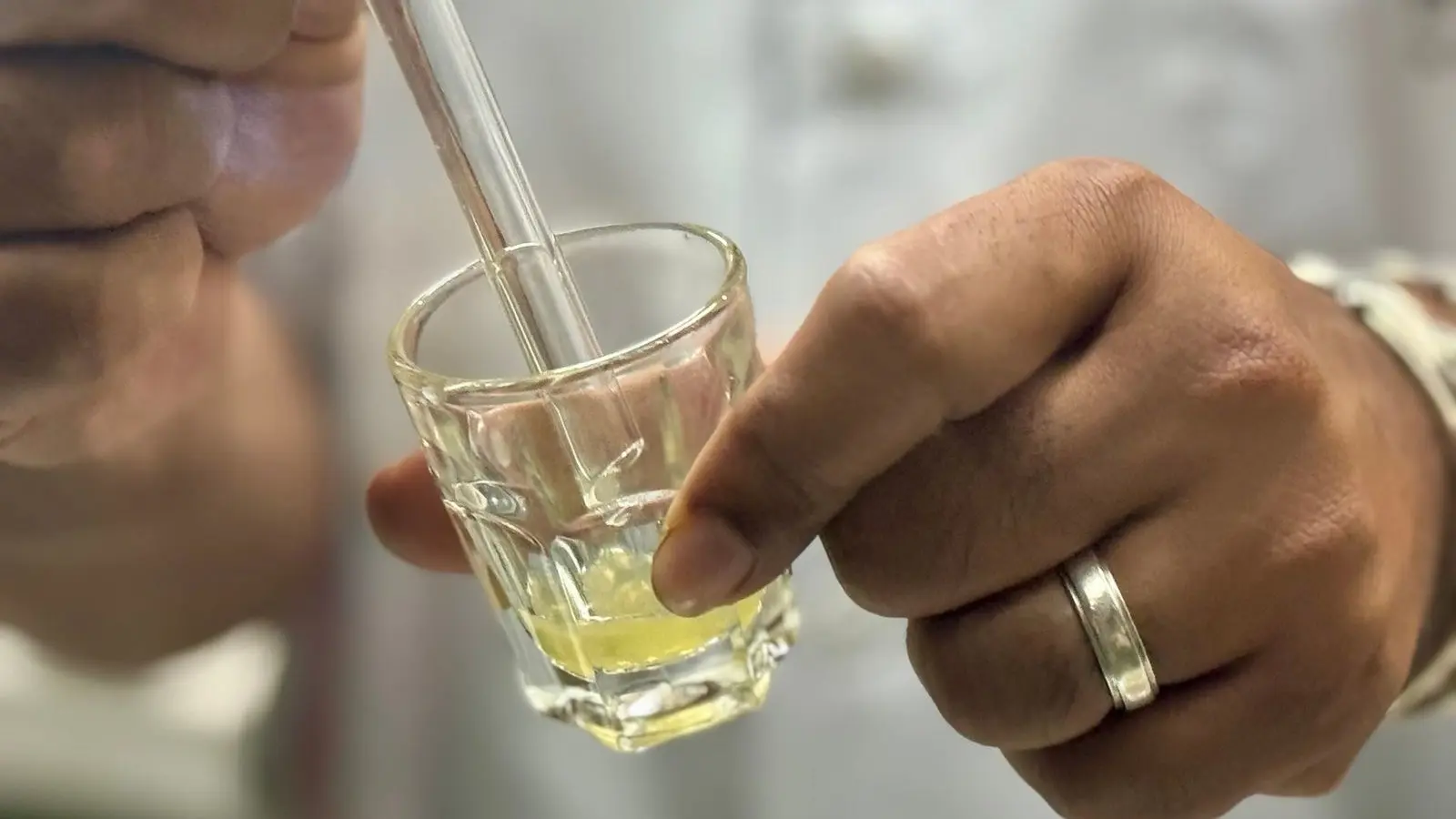 Aus sicherem Abstand verfolgen die Besucher, wie die Fangzähne die Membran durchstoßen und kurz darauf langsam Gift herausfließt - gelblich, trüb und ziemlich zäh. Die Schlangen werden „gemolken“, wie der Vorgang im Fachjargon heißt: Der Kopf des Tieres wird dabei direkt hinter dem Schädel fixiert. Beim Biss in die Membran pressen sich die Giftdrüsen, die hinter den Augen liegen, zusammen - und das Gift fließt über die Fangzähne mittels eines Trichters in ein Glas.