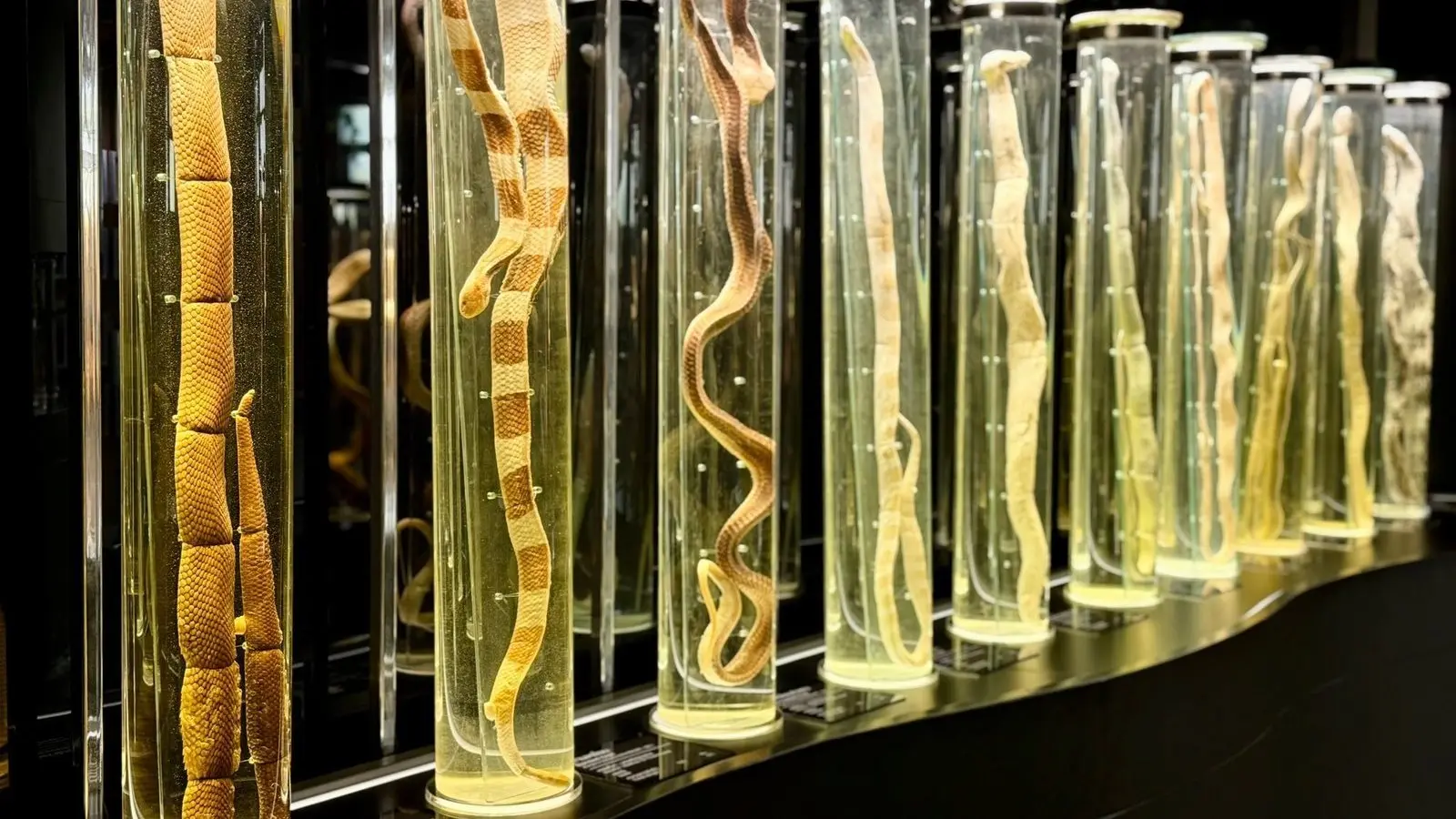 Hier sind zahlreiche imposante Exemplare in riesigen Glasbehältern konserviert, von der gefürchteten Königskobra, die mit ihrem Toxin sogar Elefanten überwältigen kann, bis hin zu einer schwach giftigen Art mit dem kuriosen Namen Puffgesicht-Wasserschlange. Kaum eine Frage zu den faszinierenden Reptilien bleibt unbeantwortet.