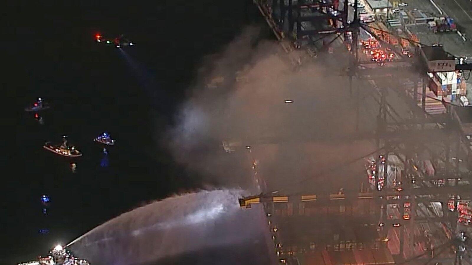 Am Freitagabend war das Feuer auf dem im Hafen von LA angedockten Schiff ausgebrochen, auch Container mit Gefahrstoffen brennen.