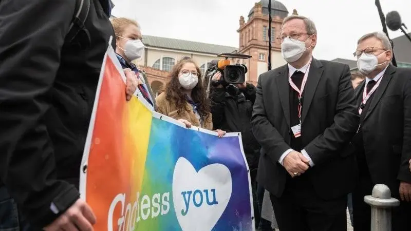 Der Vorsitzende der Deutschen Bischofskonferenz Georg Bätzing spricht vor der Synodalversammlung in Frankfurt mit Demonstranten, die eine vielfältigere Kirche fordern.
