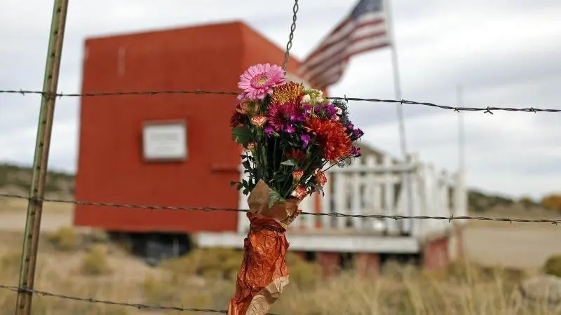 In Gedenken an die verstorbene Kamerafrau: Ein Blumenstrauß vor der Bonanza Creek Film Ranch.