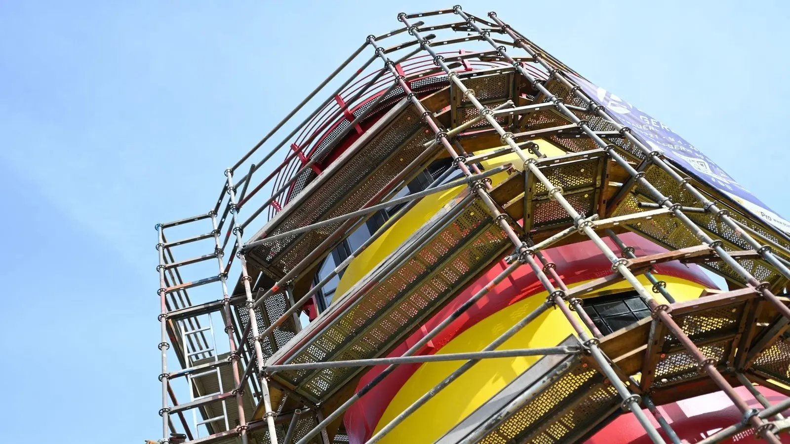 Seit Mitte Januar ist der elf Meter hohe Turm eingerüstet, damit alle sieben roten und gelben Ringe neu gestrichen werden können. „Das ist das letzte Mal 2020 passiert und nun sechs Jahre her“, erzählt Rosenberg. Die Arbeiten würden bewusst jetzt im Winter geleistet, wo es am Turm ruhiger zugehe. Zwischenzeitlich wurden die Malerarbeiten wegen der frostigen Witterung allerdings eingestellt.