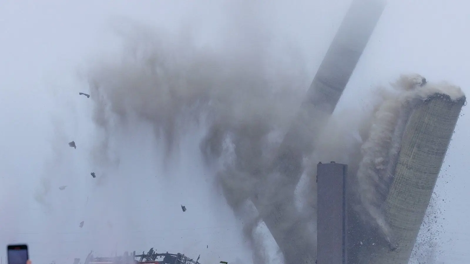 Ein lauter Knall und viel Staub: In Ibbenbüren im nördlichen Westfalen ist der 275 Meter hohe Schornstein des ehemaligen Steinkohlekraftwerks gesprengt worden. Die zahlreichen Schaulustigen konnten allerdings nur einen Teil des Spektakels sehen, denn die obere Hälfte des Schornsteins war von Nebel und Wolken verdeckt. Mit der Sprengung ist die letzte bis Niedersachsen zu sehende Landmarke des früheren RWE-Kraftwerks verschwunden.