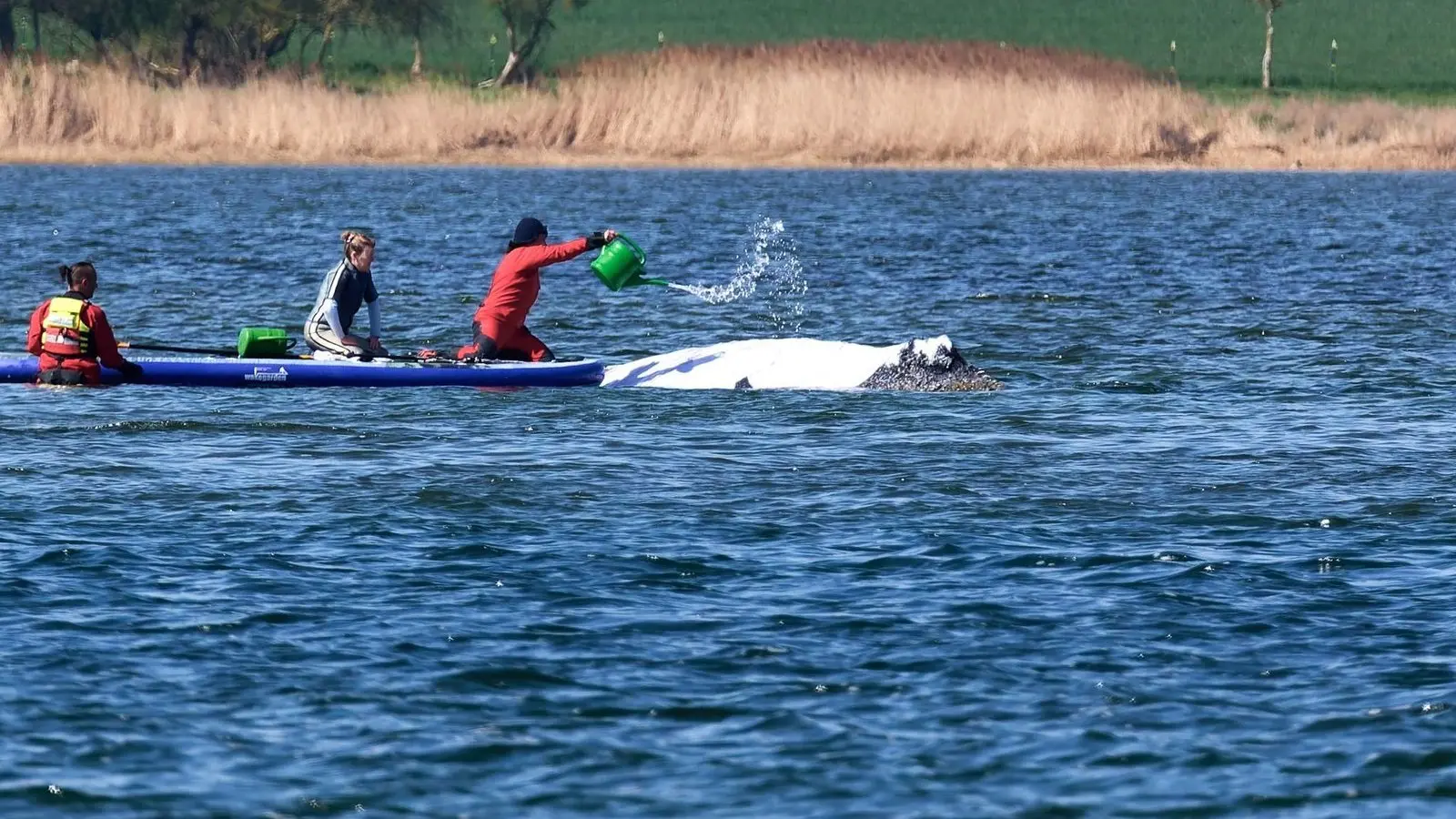 Der Buckelwal wird von Helfern vor der Insel Poel mit Wasser aus einer Gießkanne bespritzt.