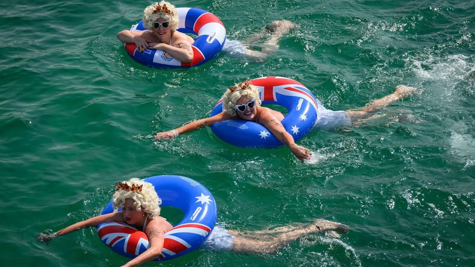 Insgesamt hatten sich 765 Menschen für die Veranstaltung angemeldet, um mit platinblonden Perücken, weißem Badeanzug und rotem Lippenstift rund 400 Meter um den Pier der Stadt Brighton zu schwimmen, wie der Sender ABC Australia am Sonntag berichtete.