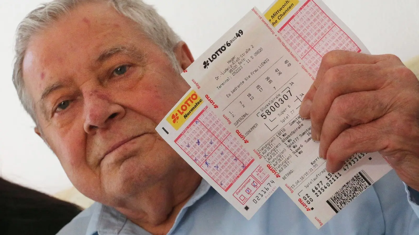Erwin D. hält den Lottoschein in den Händen, der ihn fast zum Multimillionär gemacht hätte. Der Rentner hatte die richtigen Zahlen für den Lotto-Jackpot über rund 8,9 Millionen Euro getippt. Doch er hatte den Schein zu spät abgegeben.