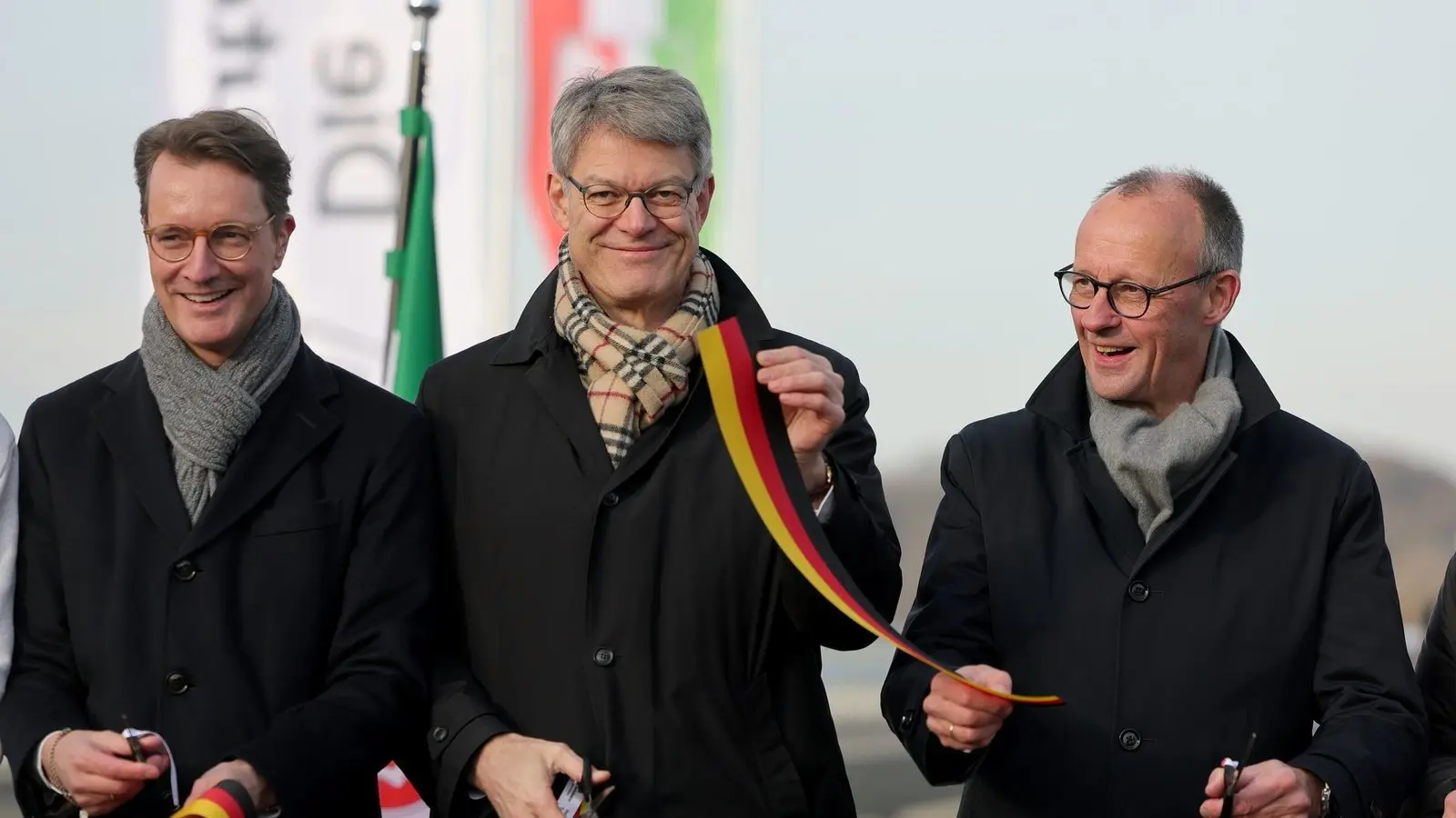 Symbolische Freigabe: NRW-Ministerpräsident Hendrik Wüst, Bundesverkehrsminister Patrick Schnieder und Bundeskanzler Friedrich Merz auf der Rahmedetalbrücke.