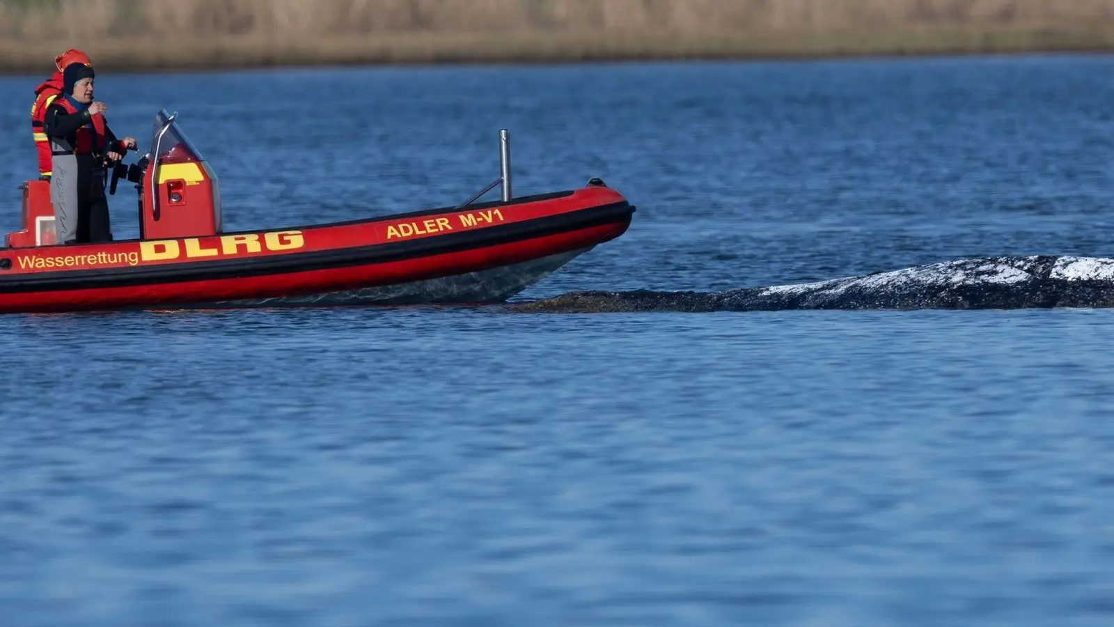 Nach drei Wochen an derselben Stelle war der Wal am Montagmorgen bei steigendem Wasserstand plötzlich losgeschwommen. Von Booten aus versuchten Helfer, ihn Richtung Ostsee zu treiben. Nach zwei Stunden stoppte das vermutlich erschöpfte Tier aber am Übergang der Bucht namens Kirchsee in die Wismarbucht, wo deutlich tieferes Fahrwasser Richtung Ostsee führt.