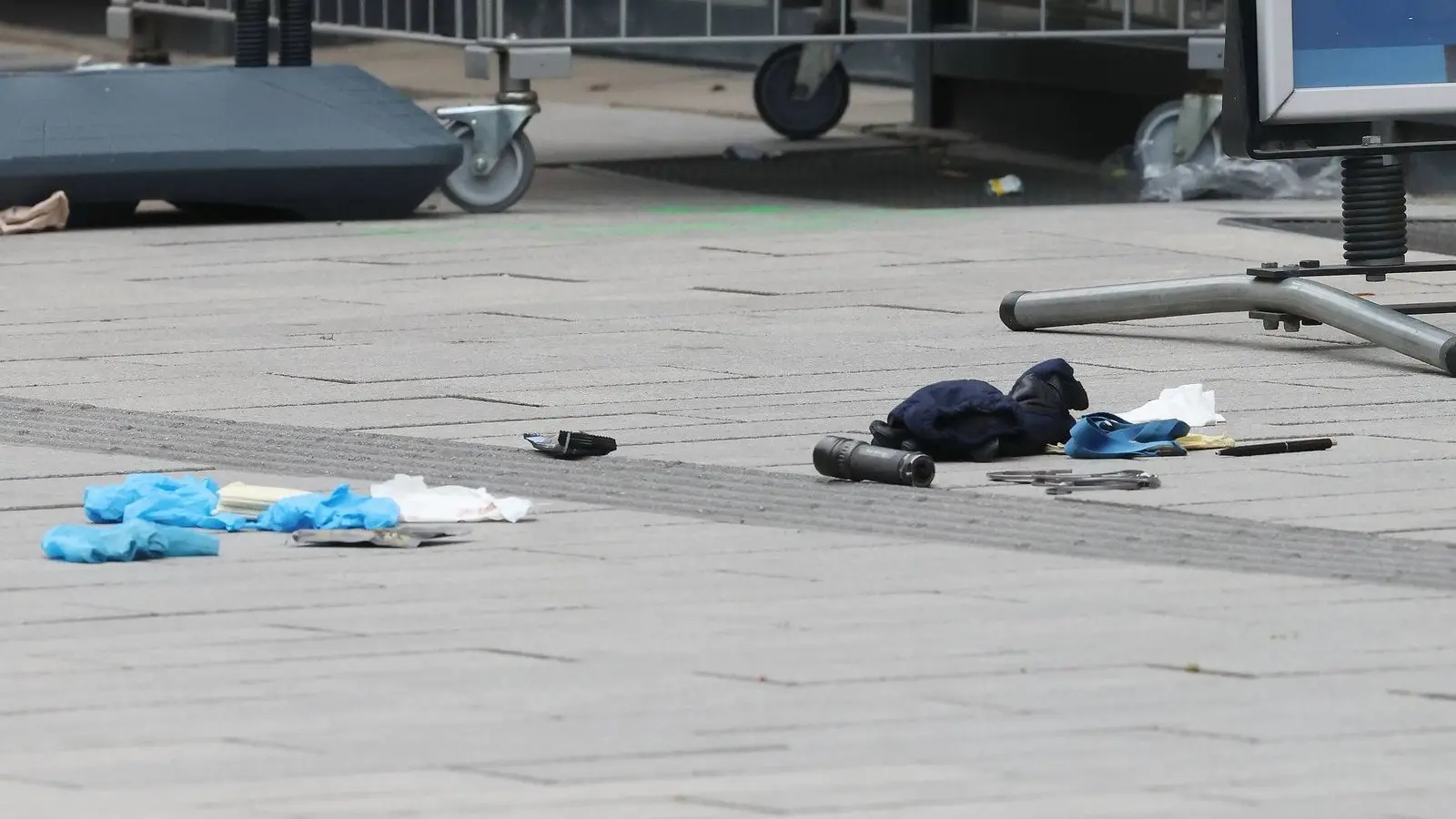 Am Tatort zeugten verstreute Utensilien von einem Notarzteinsatz. Auch eine Pistole lag auf dem Boden, die der Polizeiwaffe Walther P99 ähnlich sieht, aber von dem 40-Jährigen stammen soll. Weitere Verletzte gab es nicht. Die weiteren Ermittlungen wurden aus Neutralitätsgründen vom Polizeipräsidium Duisburg übernommen.