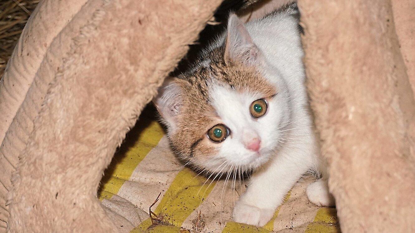 Die Angst ist diesem Kätzchen ins Gesicht geschrieben. Da hilft eine ruhige Höhle oder etwas Ablenkung mit Spielsachen.