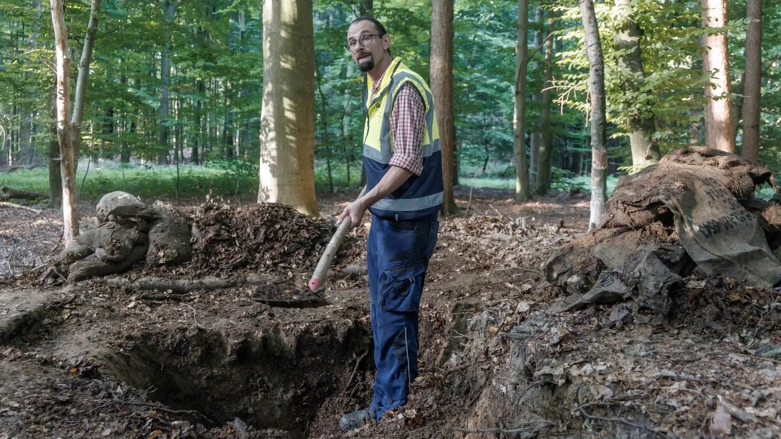 Vorsichtig arbeitet sich Grabungshelfer Christian Bartels mit seiner Schaufel in dem lehmigen Boden eines Waldes bei Ahrensbök in Schleswig-Holstein voran. Erst kommen auf dem mehrere Tausend Jahre alten Grabhügel Fetzen aus Leinen zum Vorschein, dann ein ganzer, befüllter Sandsack mit Bundeswehr-Nummer. Schnell zweifelt Grabungsleiter Christoph Unglaub vom Archäologischen Landesamt an der Ursprungsthese, dass hier Raubgräber am Werk waren.