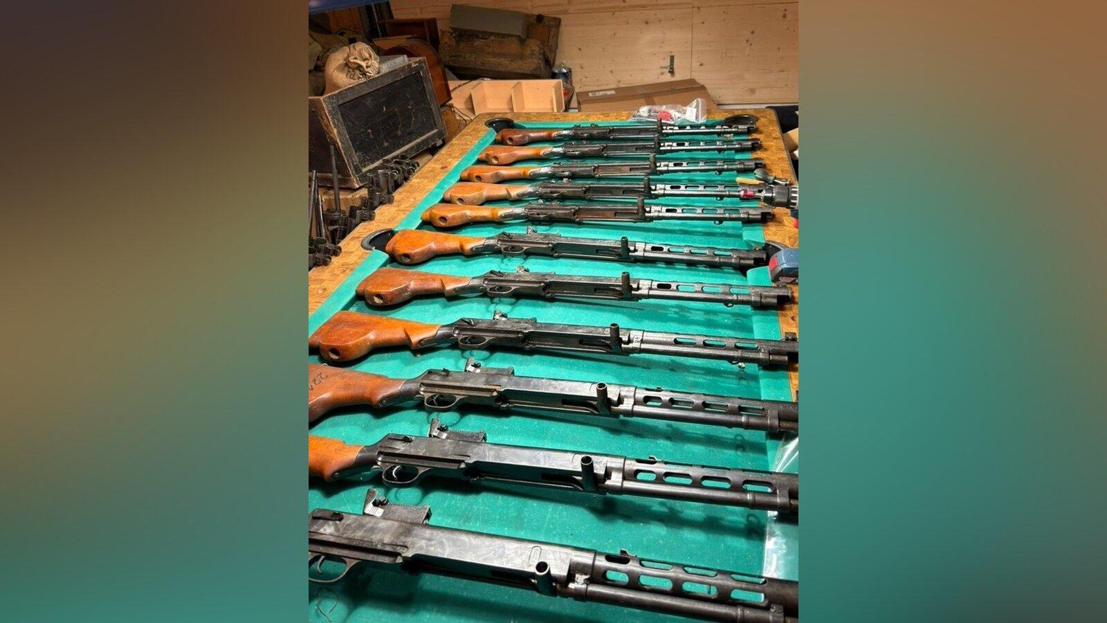 Der nun entdeckte Geheimraum mit 29 Maschinengewehren und drei Panzerbüchsen befinde hinter einer weiteren Vitrine im Keller, hieß es. Die umfangreichen Durchsuchungsmaßnahmen in dem Fall dauerten an.