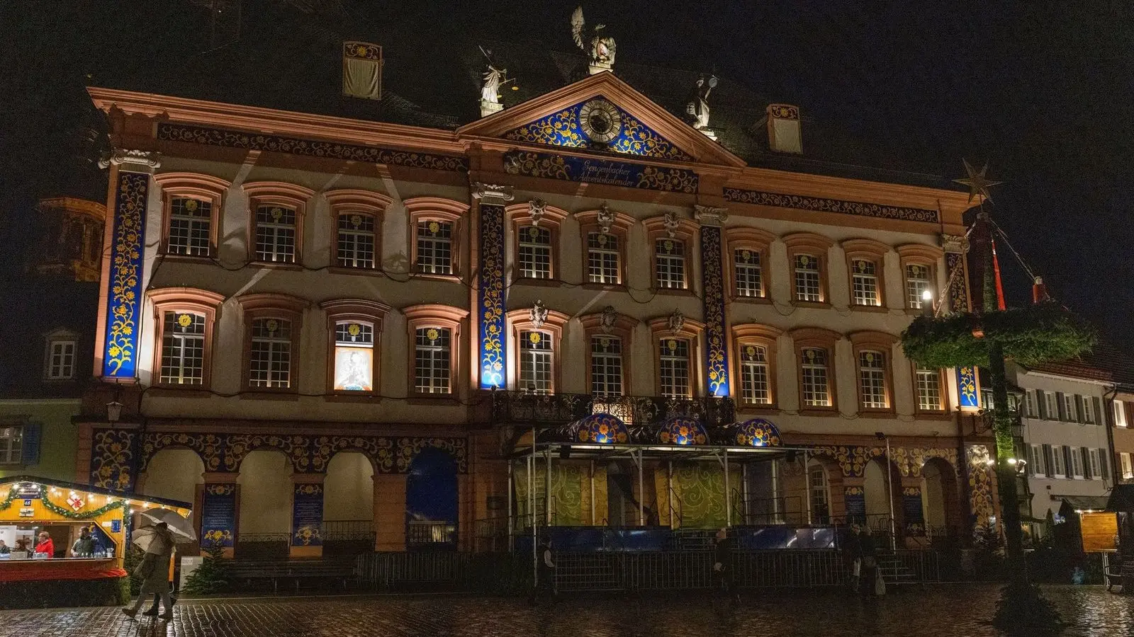 In der historischen Altstadt von Gengenbach im Schwarzwald wird die Fassade des Rathauses zu einem überdimensionierten Adventskalender umfunktioniert.