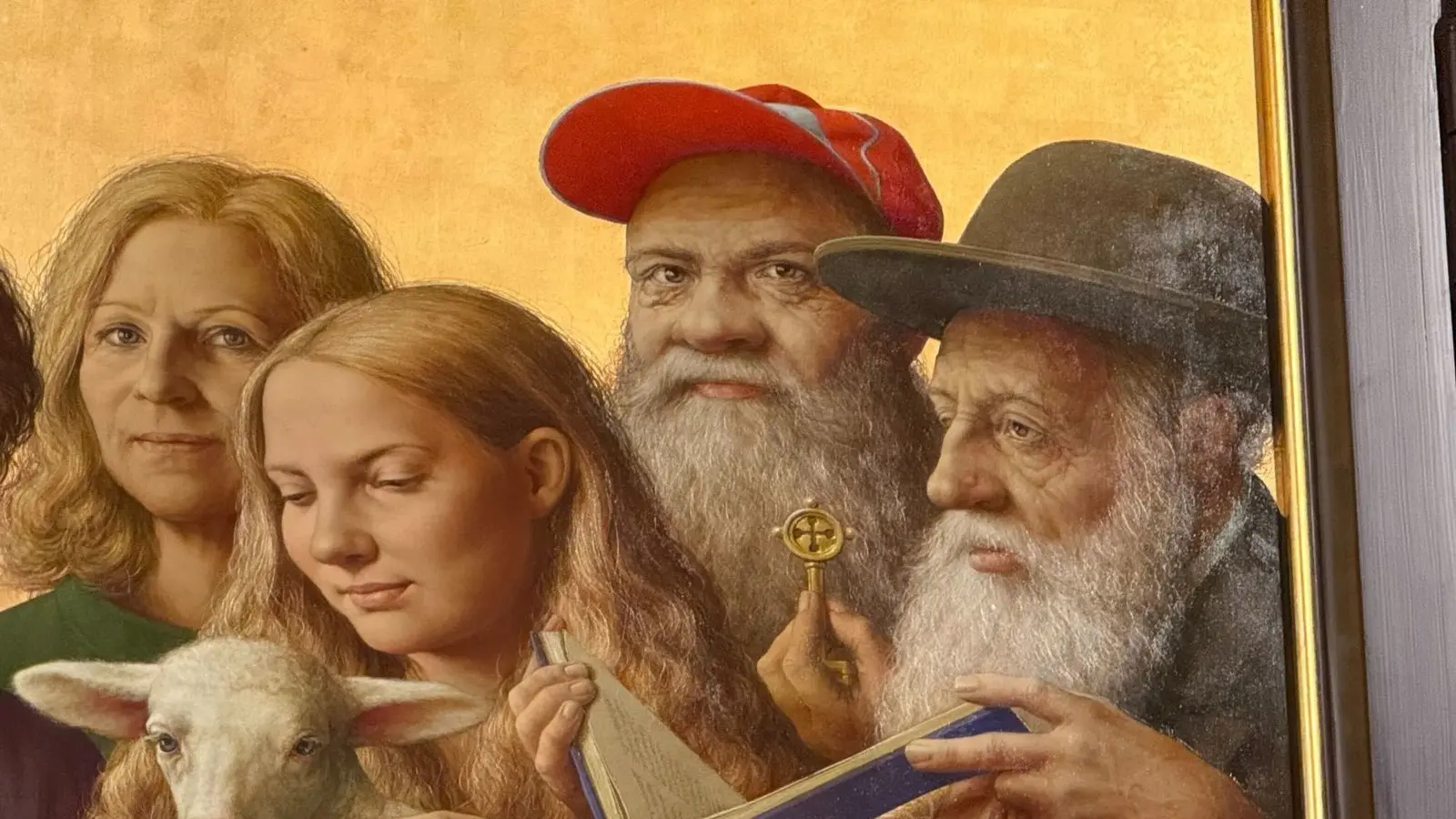 Das Porträt nutzte Triegel auch, als er den Auftrag bekam, für ein im 16. Jahrhundert schwer beschädigtes Altargemälde von Lucas Cranach dem Älteren (1472-1553) aus dem Dom von Naumburg (Sachsen-Anhalt) einen neuen Mittelteil zu malen. Dort ist der Obdachlose aus Rom nun inmitten anderer moderner Figuren auf goldenem Grund als Petrus mit rotem Basecap zu sehen, der Zweite von rechts.