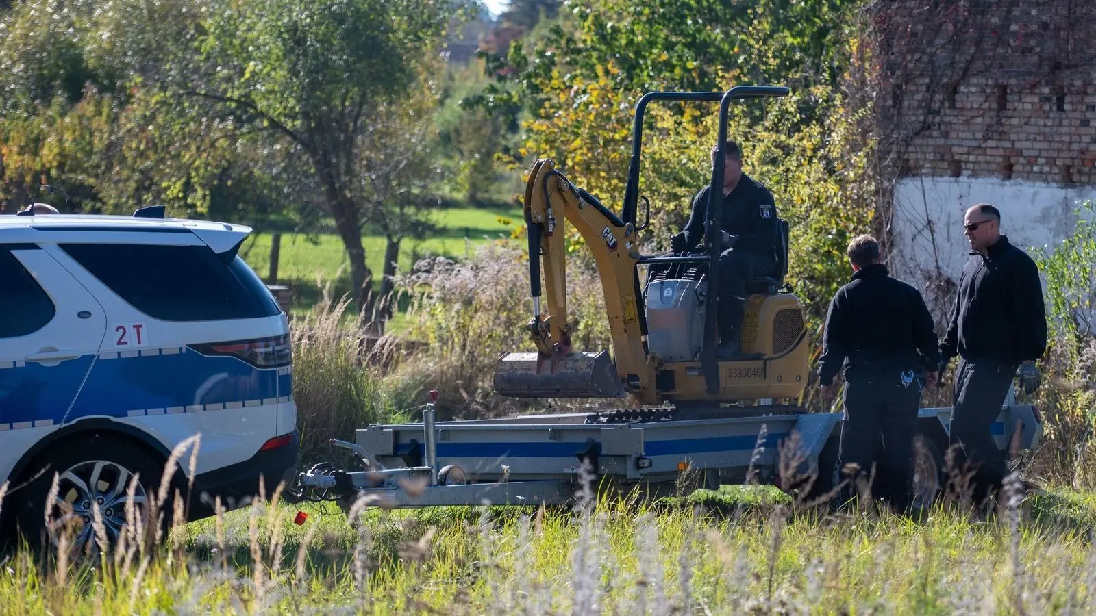 Polizisten untersuchen mit einem Bagger ein Grundstück in Herzberg (Landkreis Oder-Spree).