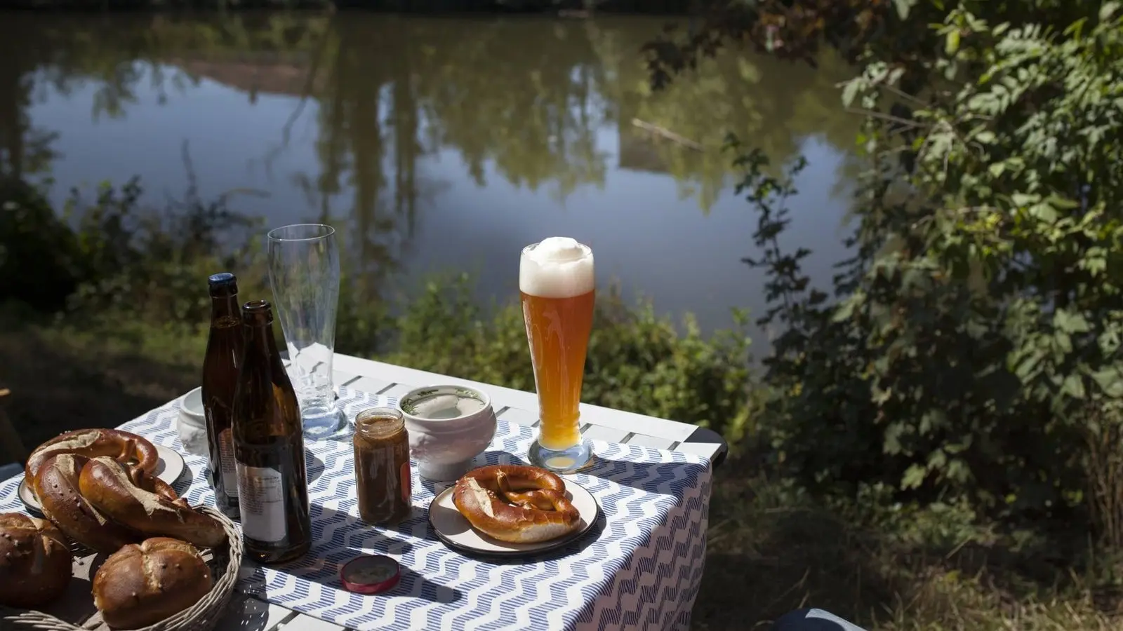 Ein Anblick, den man gut und gerne als "Himmel der Bayern" bezeichnen kann: Eine zünftige Brotzeit mit Brezn, Weißwürscht und Weißbier am Wasser. Unter den folgenden Bildern finden Sie anlässlich des diesjährigen "Tags des Bieres" etwas ungewöhnlichere Einblicke in die Welt des Bieres als diesen ...