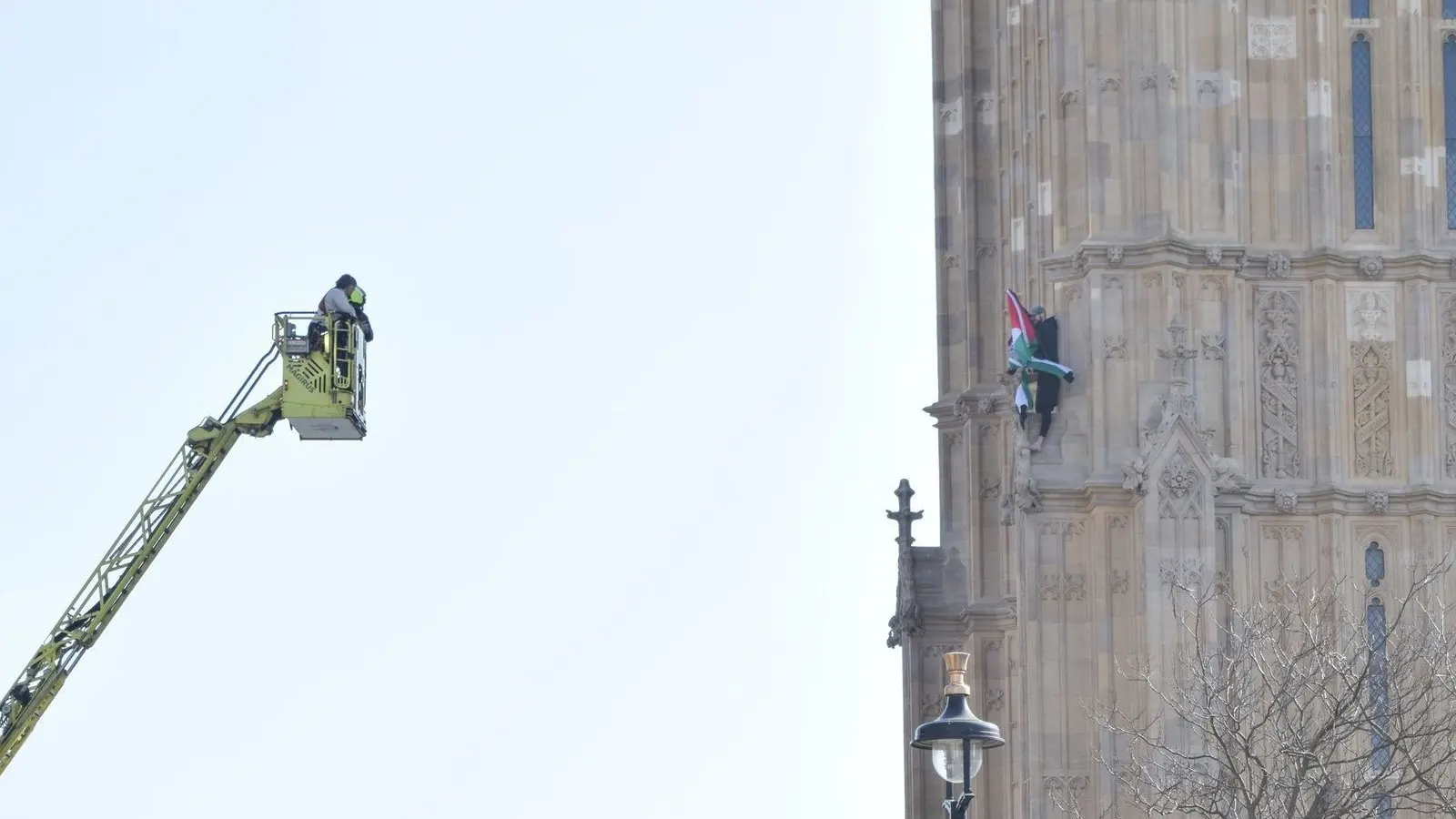 Mit einer Palästinenserflagge ist ein Demonstrant am frühen Samstagmorgen in London auf den Uhrturm am britischen Parlament geklettert - erst kurz nach Mitternacht (Ortszeit) kam er wieder herunter. Fernsehbilder zeigten, wie der Mann schließlich mit einer Hebebühne der Feuerwehr vom Elizabeth Tower heruntergeholt wurde, wo sich die berühmte Glocke Big Ben befindet.