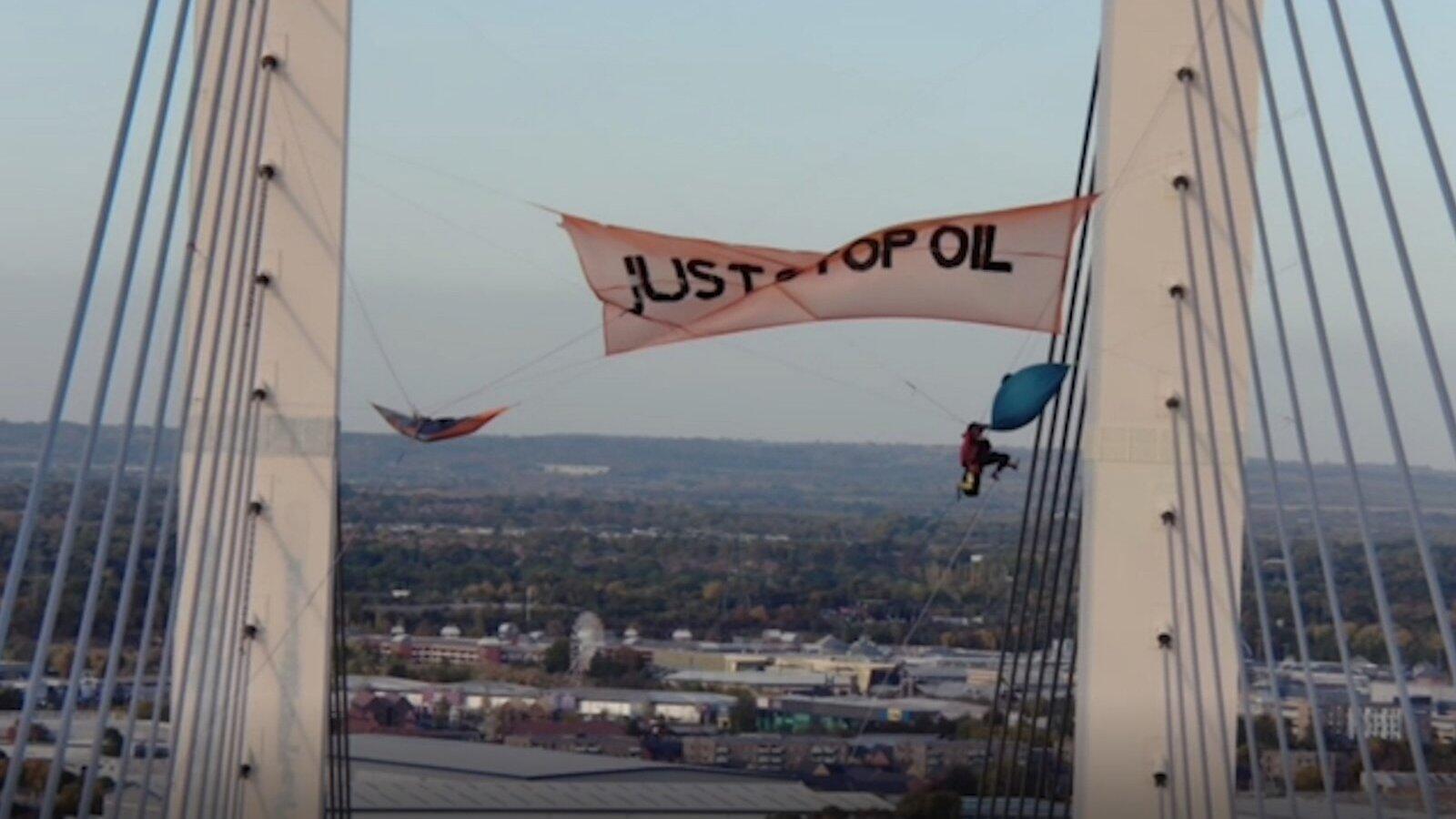 Dieses undatierte von der Polizei von Essex zur Verfügung gestellte Videostandbild zeigt die beiden Aktivisten der Gruppe "Just Stop Oil", Morgan Trowland und Marcus Decker, die im Oktober 2022 eine Themse-Brücke erklommen haben. Bereits in Haft droht Marcus Decker nun auch eine Abschiebung nach Deutschland.