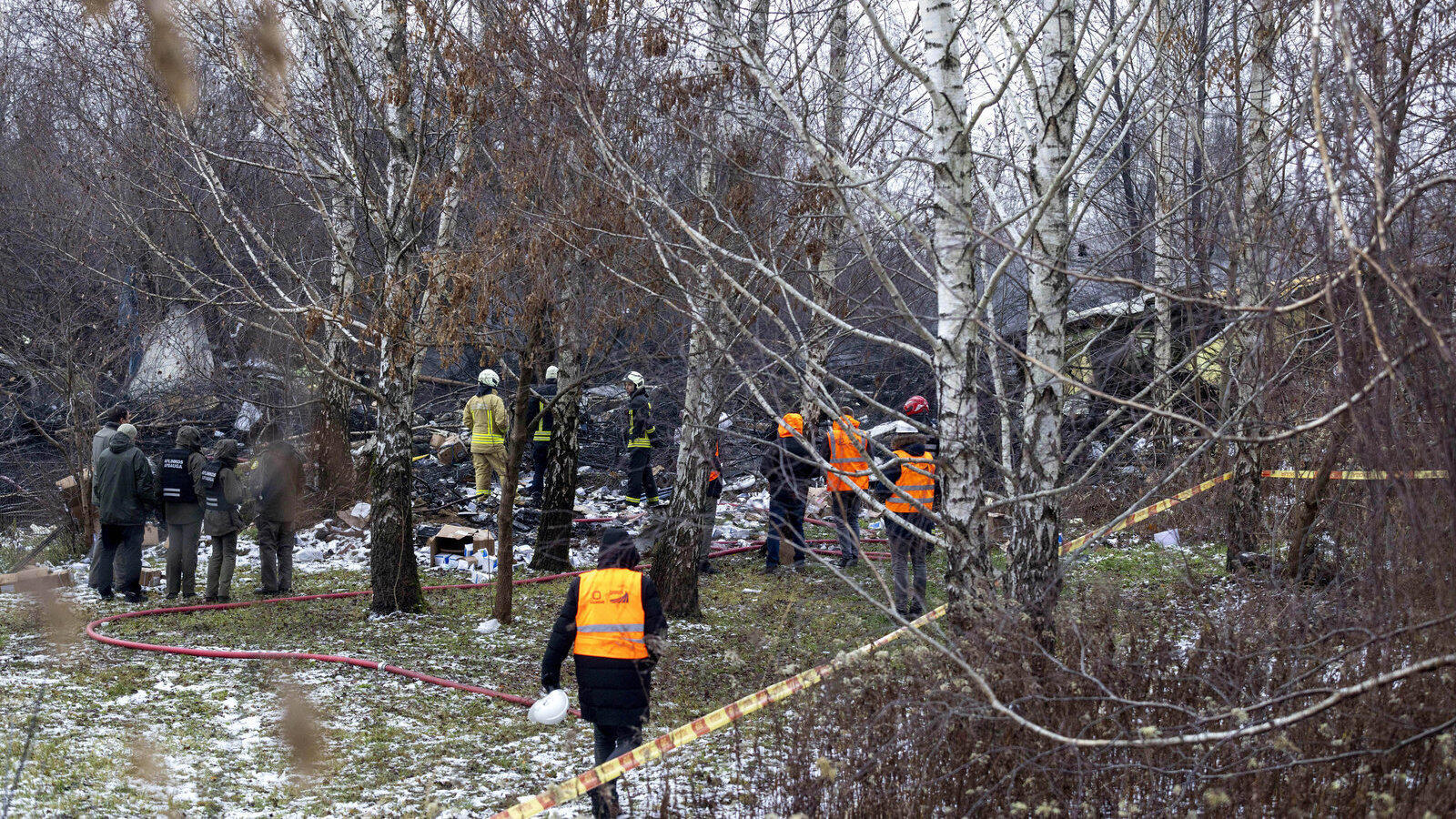 Mitarbeiter des litauischen Katastrophenschutzministeriums arbeiten in der Nähe der Stelle, an der ein DHL-Frachtflugzeug in ein Haus in der Nähe der litauischen Hauptstadt Vilnius, Litauen, gestürzt ist.