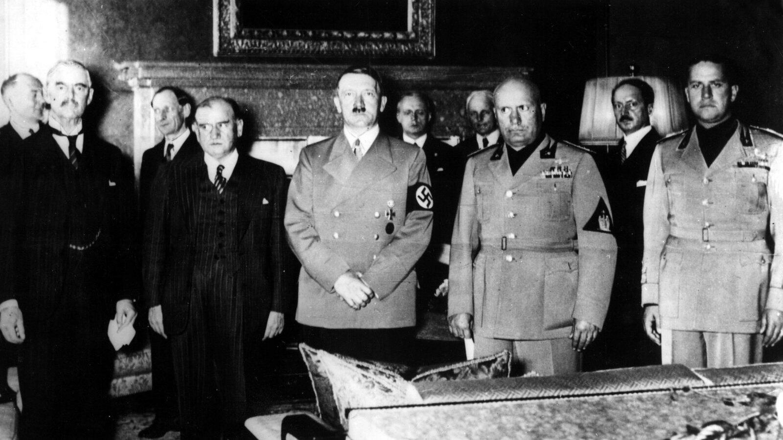 Bei der Unterzeichnung des Münchner Abkommens 1938 steht Adolf Hitler (M.) zwischen (v. l.) Arthur Neville Chamberlain (Großbritannien), Édouard Daladier (Frankreich), Benito Mussolini (Italien) und Graf Galeazzo Ciano (Italien). Der amerikanische Professor Daryl G. Press hat herausgearbeitet, dass das Abkommen nicht in den Zweiten Weltkrieg hineinführte.