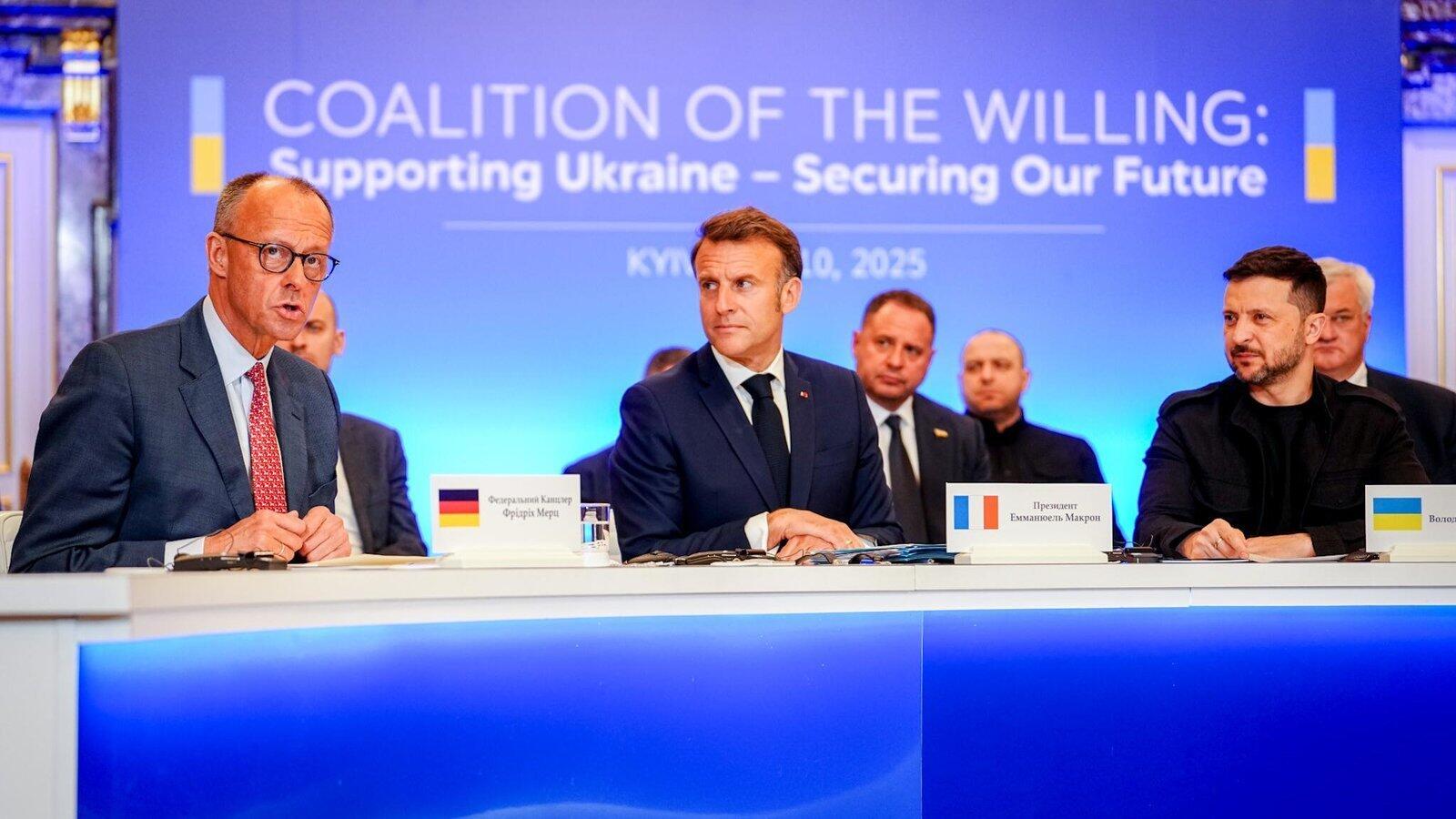 Kanzler Friedrich Merz (l.) und Frankreichs Präsident Emmanuel Macron (M.) schließen sich mit Polen und Großbritannien, obwohl das Land kein EU-Mitglied ist, zur „Koalition der Willigen“ zusammen. Die Länder wollen den ukrainischen Präsidenten Wolodymyr Selenskyj unterstützen und Sicherheitsgarantien für die von Russland angegriffene Ukraine auf den Weg bringen.