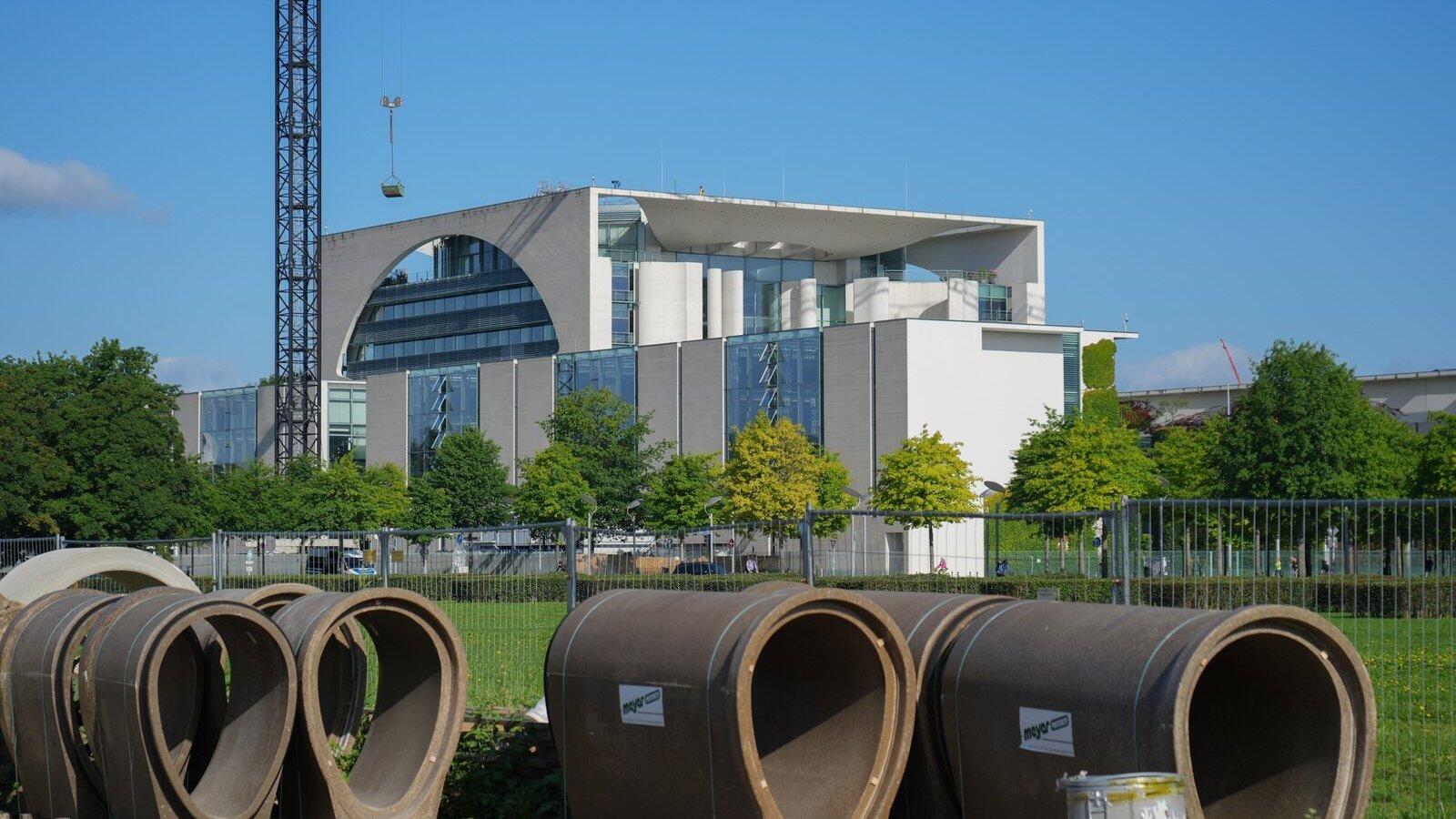Fast schon symbolisch umrahmen ein Kran und Baumaterial das Bundeskanzleramt. Die Bundesregierung hat sich viel vorgenommen.