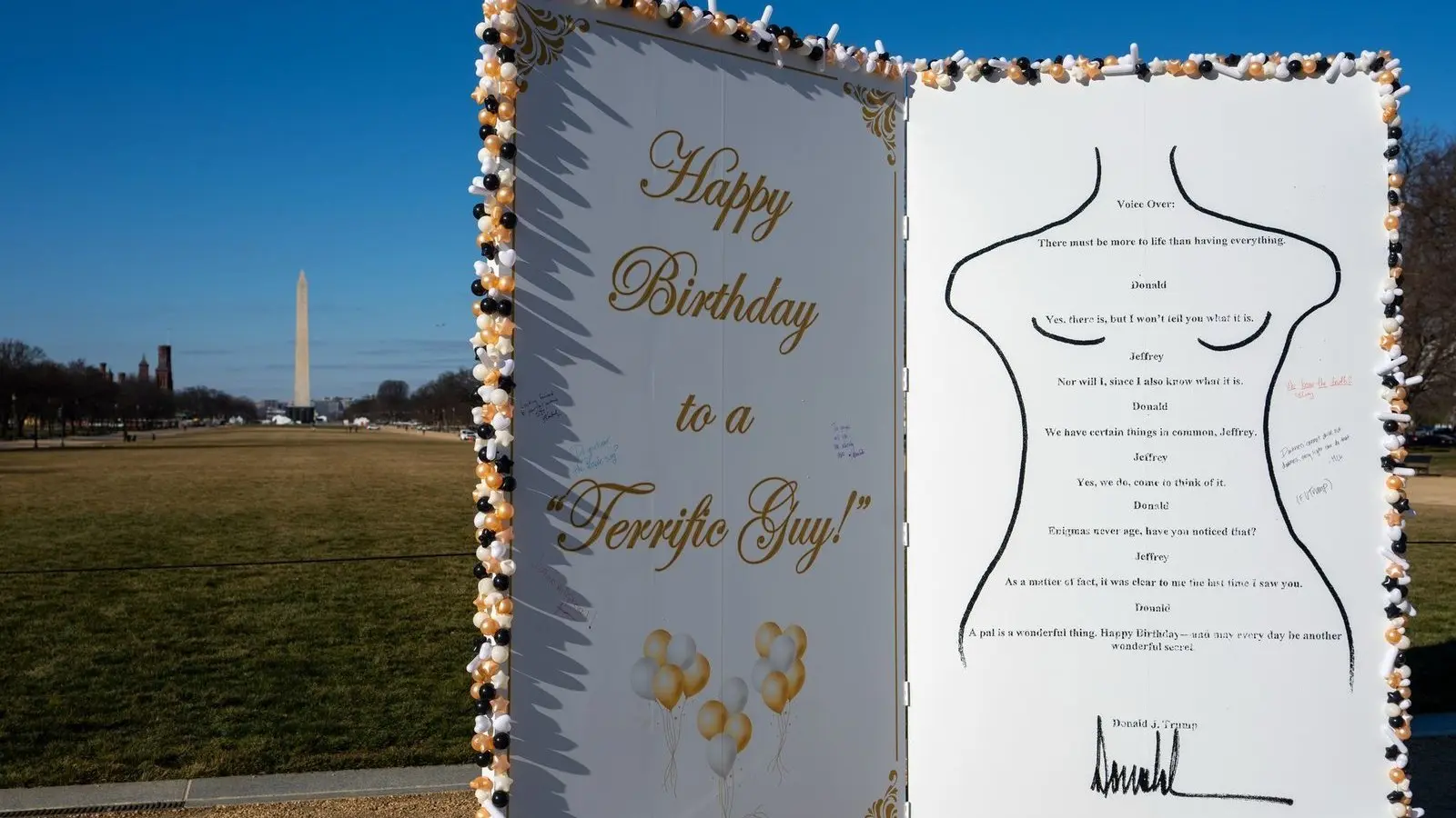 Geburtstagsgrüße, die US-Präsident Donald Trump vor mehr als 20 Jahren an den verurteilten und mittlerweile gestorbenen Sexualstraftäter Jeffrey Epstein geschrieben haben soll, sind in der US-Hauptstadt Washington als große Installation aufgetaucht. Eine Gruppe, die sich „The Secret Handshake“ nenne, habe die etwa drei Meter hohe Reproduktion auf der National Mall - der Promenade zwischen dem Kapitol und dem Lincoln Memorial - aufgestellt, berichtete der US-Sender CNN. Epsteins Geburtstag ist am 20. Januar.