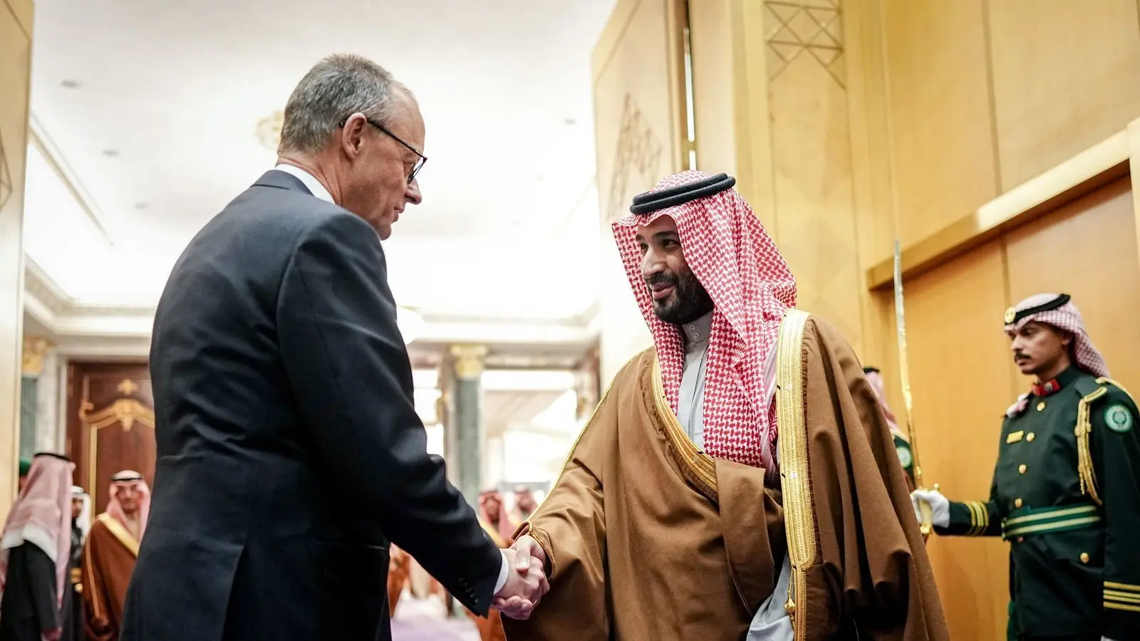 Bundeskanzler Friedrich Merz hat bei seinem Treffen mit dem saudischen Kronprinzen Mohammed bin Salman betont, dass er die Beziehungen zu dem ölreichen Golfstaat auf „ein neues Niveau“ heben wolle. Aus seiner Delegation hieß es, die zweieinhalbstündigen Gespräche vor und während eines Abendessens im Königspalast von Riad seien „herzlich und offen“ verlaufen.