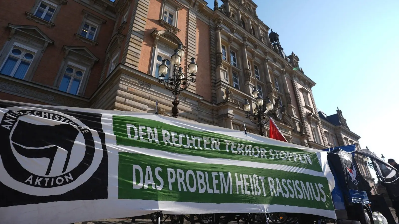 Vor dem Gerichtssaal demonstrierten Mitglieder der Antifa. Auf einem Banner stand „Den rechten Terror stoppen. Das Problem heißt Rassismus“.