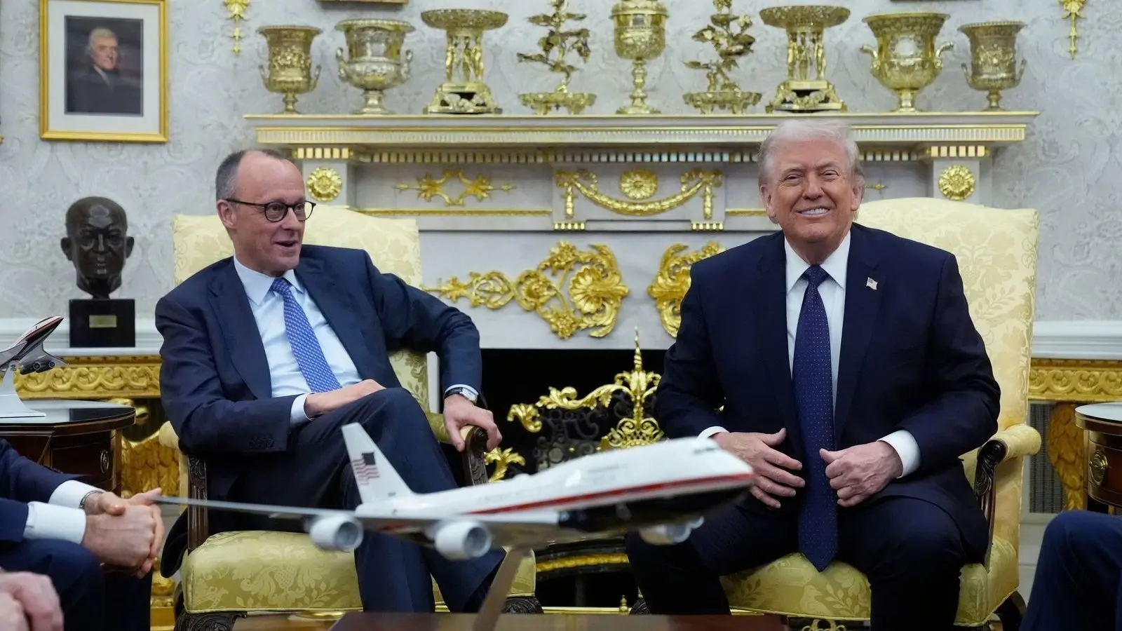Trump witzelte an den ebenfalls im Oval Office anwesenden US-Handelsbeauftragten Jamieson Greer gewandt: „Wie behandeln wir Deutschland? Ich denke, bei denen solltest du sehr, sehr hart zuschlagen.“ Der US-Präsident gab Merz dabei einen Klaps aufs Knie. Der Kanzler schwieg zu dem Thema zunächst.