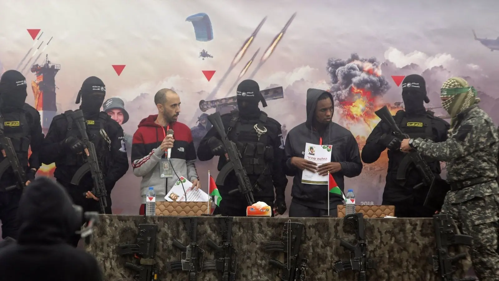 Vermummte und bewaffnete Hamas-Kämpfer in Uniformen inszenierten die Übergaben der Männer in Rafah und Nuseirat erneut mit Schaulustigen, lauter Musik und palästinensischen Fahnen. Die Geiseln wurden auf Bühnen vorgeführt. Sie erhielten von ihren bewaffneten und vermummten Bewachern sichtbar Anweisungen, zu lächeln und der wartenden Menschenmenge zuzuwinken. Eine Vertreterin des Internationalen Komitees vom Roten Kreuz (IKRK) musste auf den Bühnen an beiden Orten Empfangs-Dokumente unterzeichnen.